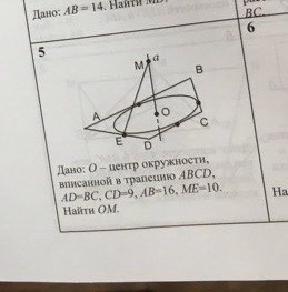 Если окружность вписана в трапецию, значит для нахождения её радиуса используем формулу: r=√(АВ*DC)/2=√(16*9)/2=6, тогда по т. Пифагора МО=√(МЕ²-r²)=√(100-36)=8.
