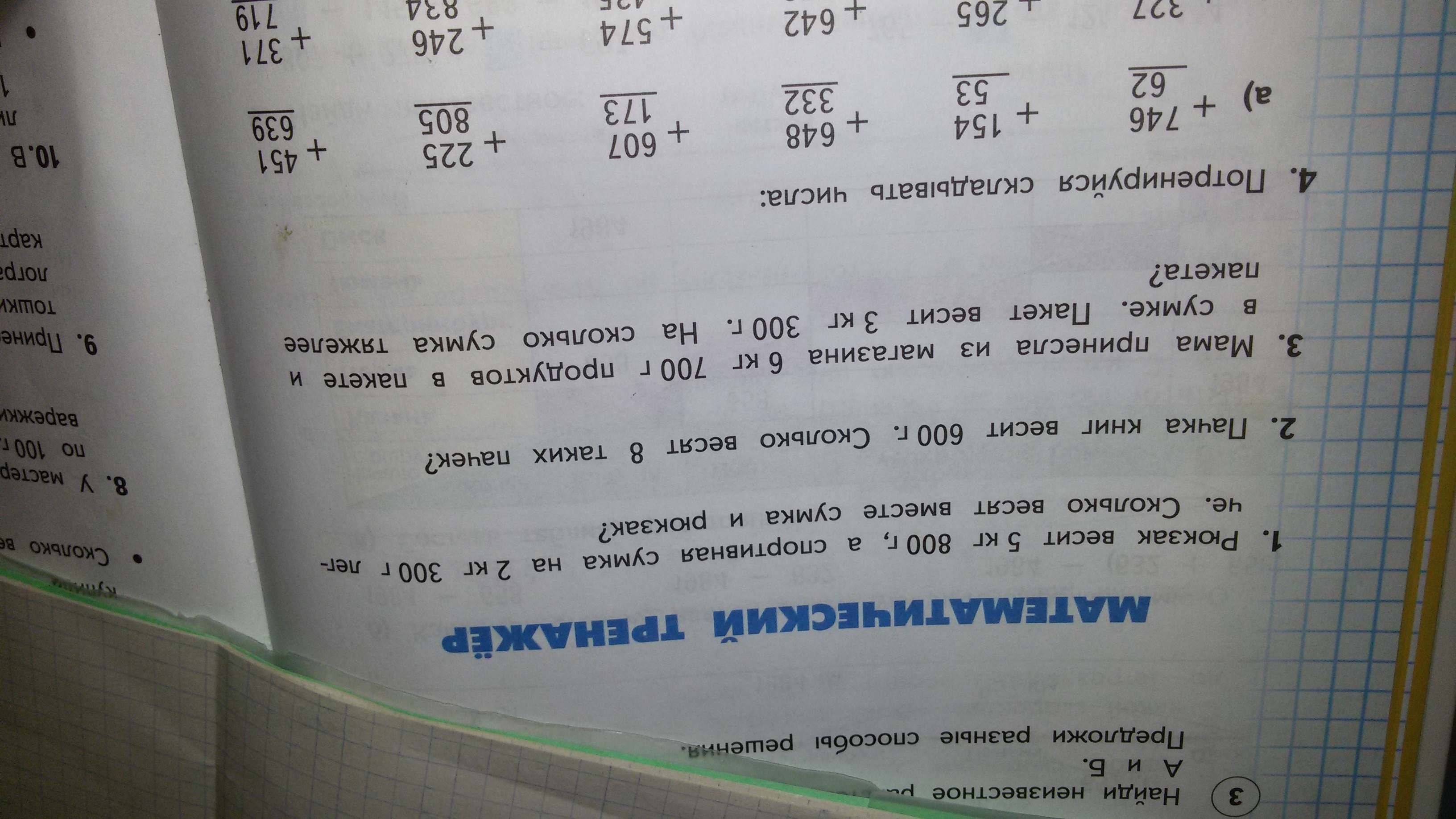 Найдем сколько весит сумка с продуктами. Для этого из общей массы продуктов вычтем массу продуктов в пакете: 6 кг 700 г - 3 кг 300 г = 3 кг 400 г (весит сумка). 3) Найдем на сколько сумка тяжелее пакета: 3 кг 400 г - 3 кг 300 г = 100 г. Ответ: сумка тяжелее пакета на 100 грамм.