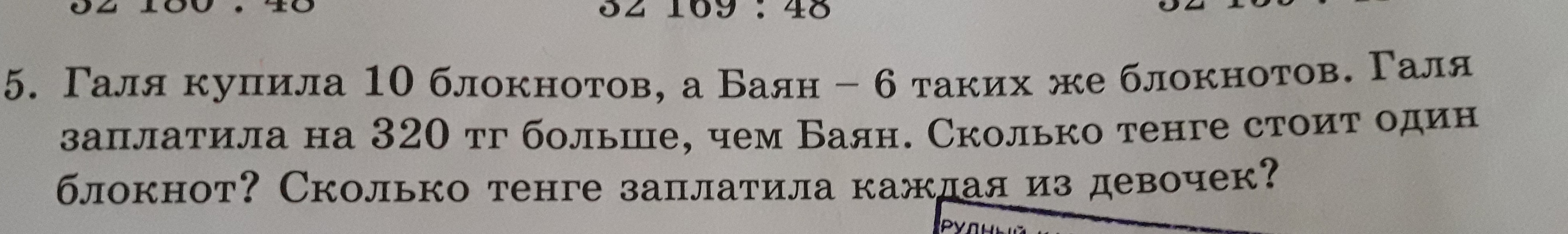 Но она купила на 10-6 = 4 блокнота больше , а заплатила на 320 тг больше. Значит эти 4 блокнота и стоили 320 тг. А чтобы узнать сколько стоит 1 блокнот - делим