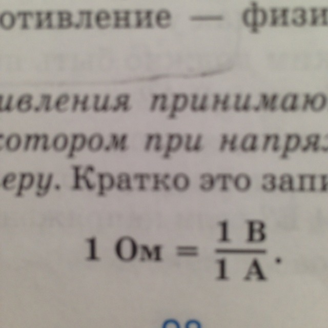 за единицу сопротивления принимают 1 ом — сопротивление такого проводника, в котором при напряжении на концах 1 вольт сила тока равна 1 амперу.