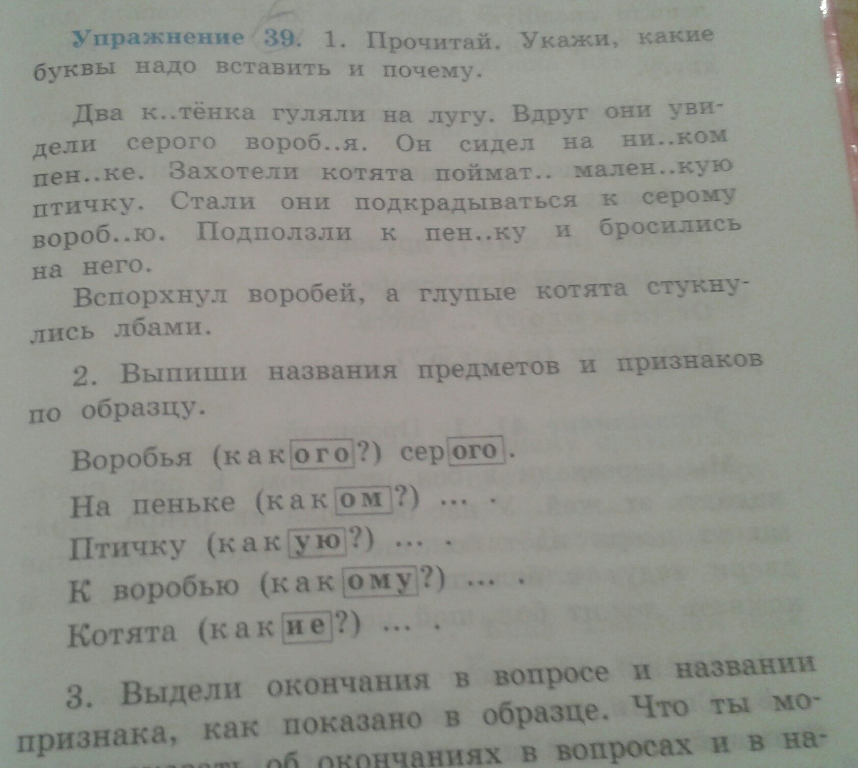 1) Котёнка,воробья,низком, пеньке,поймать,маленькую,воробью,пеньку. 2)На пеньке (каком?)низком. Птичку(какую?)маленькую. К воробью (какому?)серому. Котята(какие?)глупые.