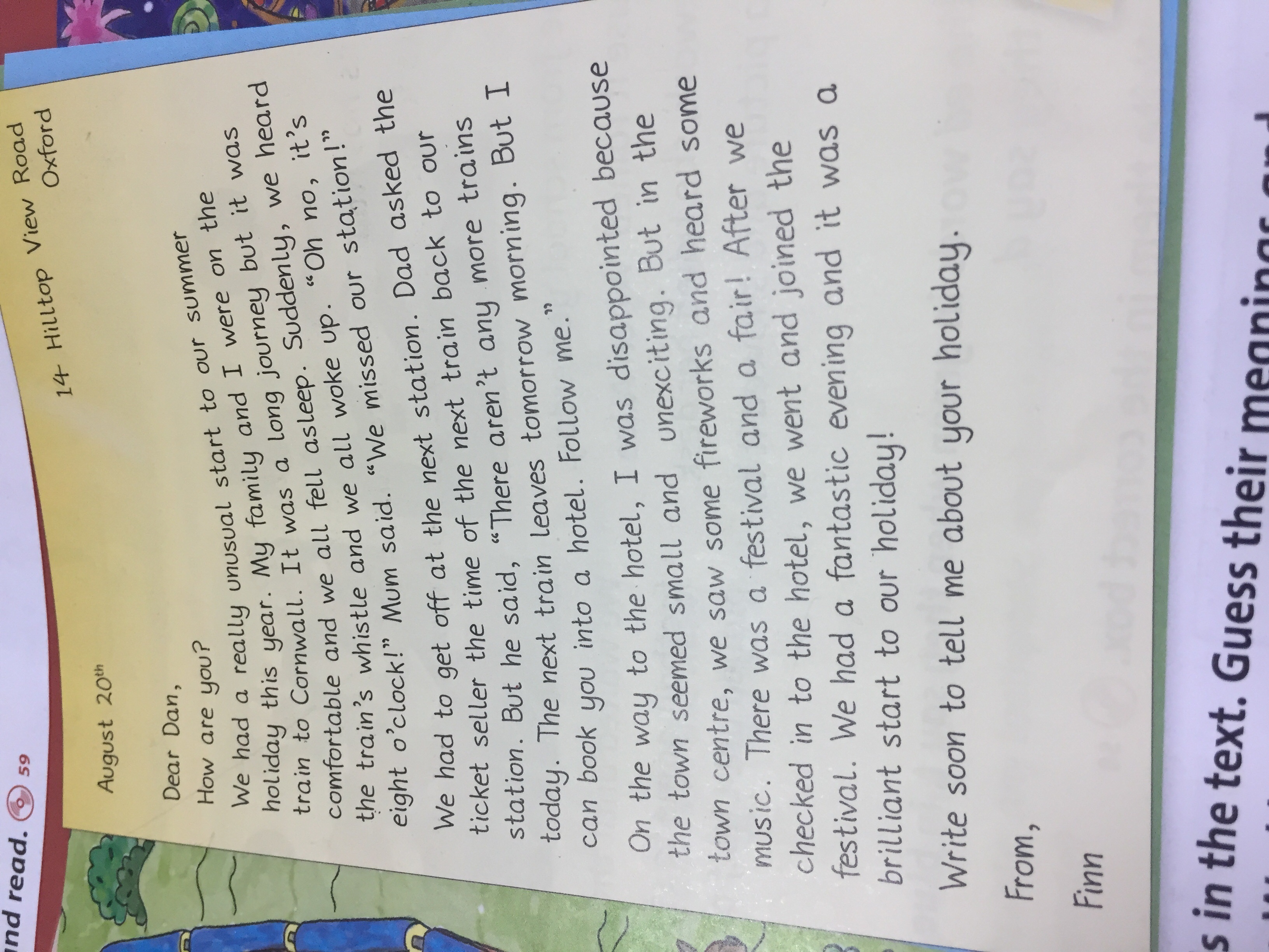 У нас было действительно необычное начало летних каникул в этом году. Моя семья и я были на поезде в Корнуолл. Это было длинное путешествие, но оно было комфортным и мы все уснули. Вдруг мы услышали свист поезда и мы все проснулись. "О, нет! Сейчас восемь часов!"—сказала мама.—"Мы пропустили нашу станцию!"