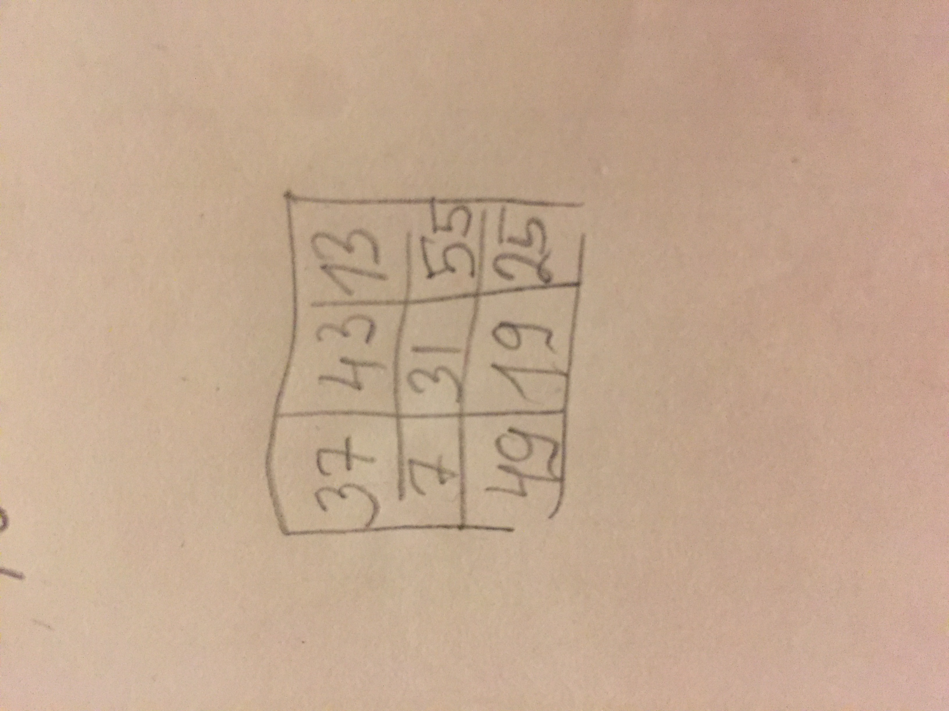 вставьте числа в пустые клетки так чтобы квадрат стал магическим 19 25 37 43 49 55 ,в первом ряду третья цифра 13 ,во втором ряду первая цифра 7 вторая 31 пожалуйста помогите очень надо