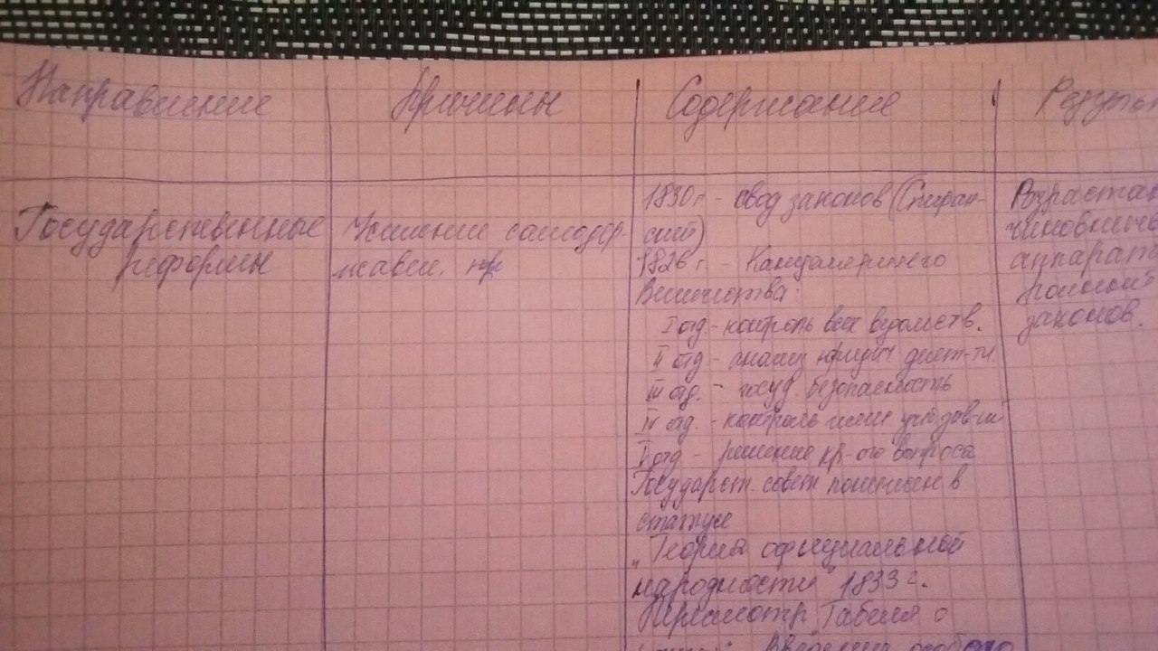 Помогите пожалуйста сделать таблицу по истории. 1)Направление, 2)причины, 3)содержание, 4)результаты реформ Николая 1 .