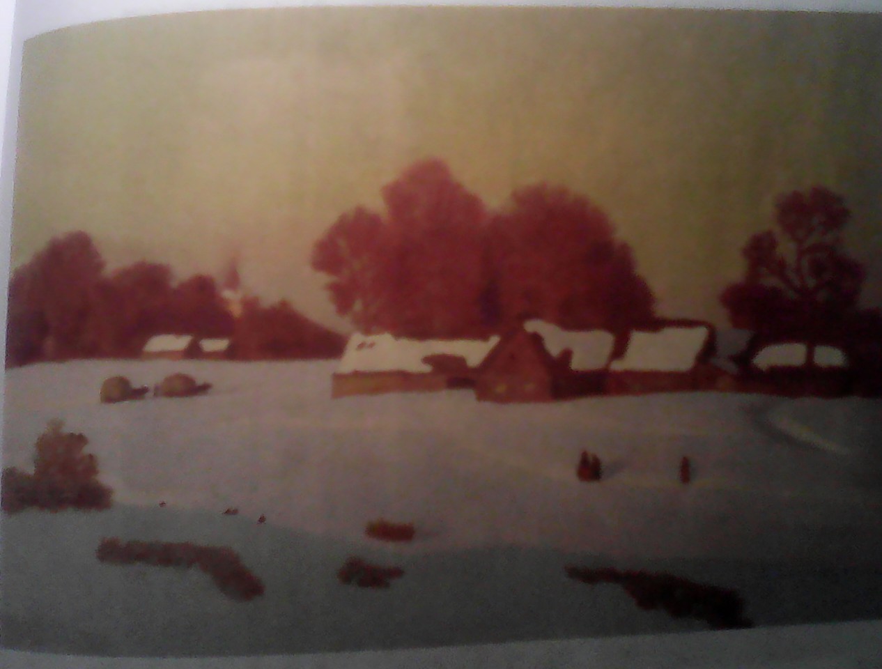 На картине мы видим изображение зимы. Мы видим деревню и деревья. Ну как то так