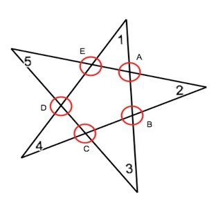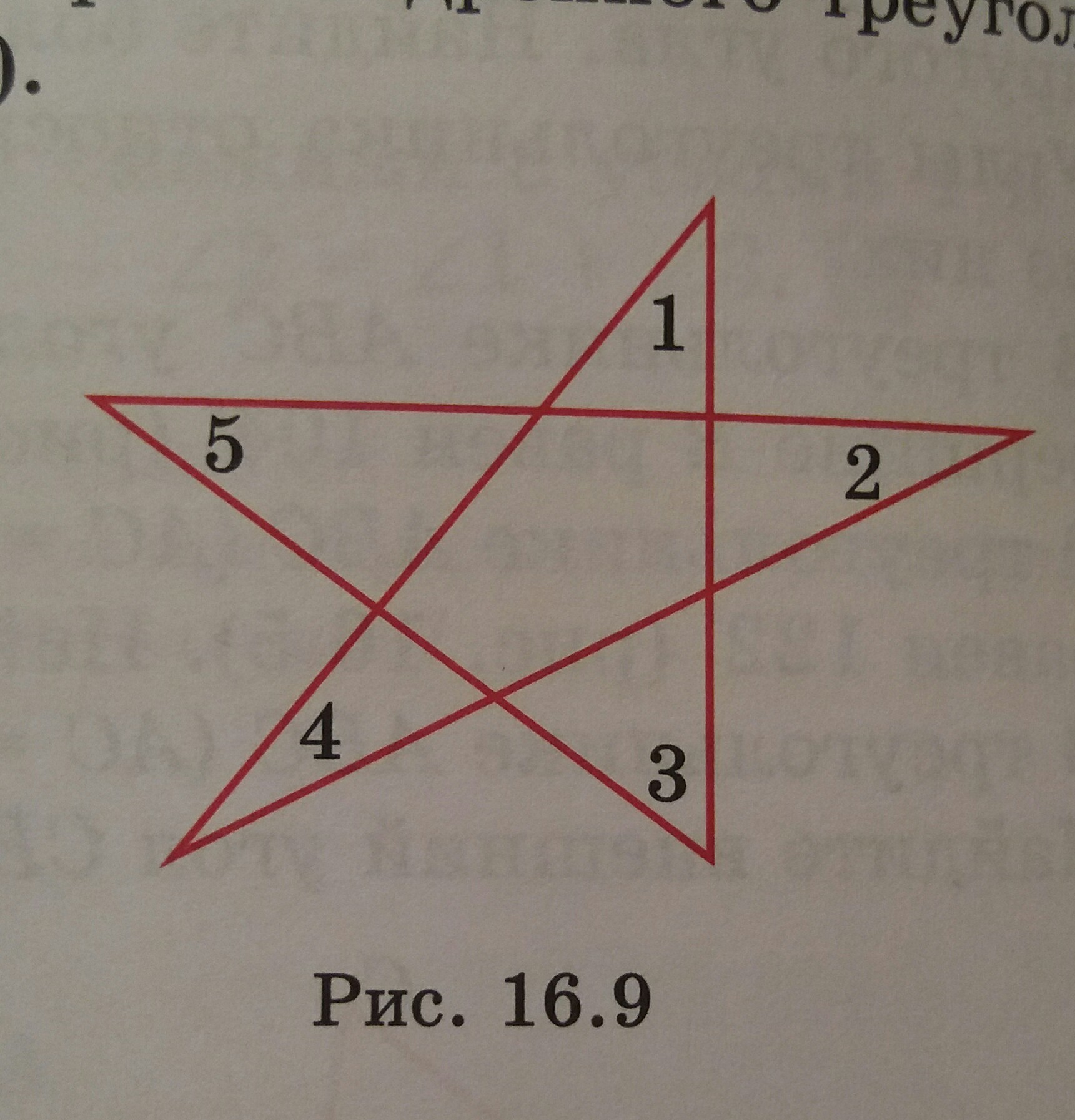 Вычтем из этой суммы суммы углов, образованных пересечением сторон звезды. Каждый из них равен 360°, или 180°•2. Т.к.их 5, всего нужно вычесть 180°•10 (см. рисунок).