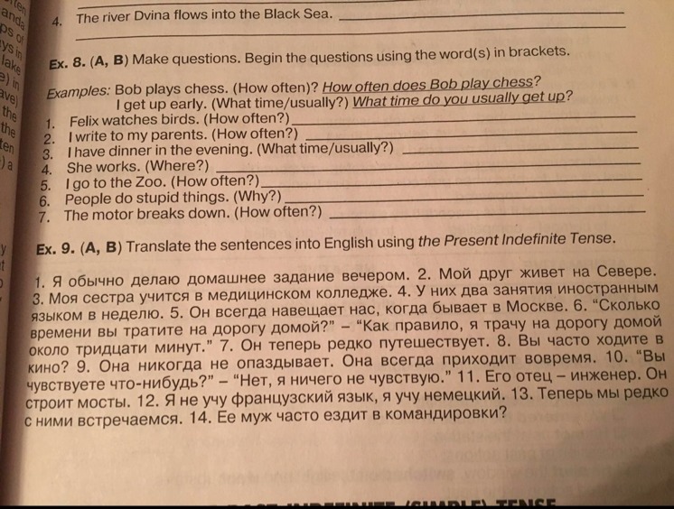 How often does felix wacth birds? How often do you write your parents? What time do you have dinner usually? Where does she wprk? How often do you go to the zoo? Why does people do stupid things? How often does the motor break down?