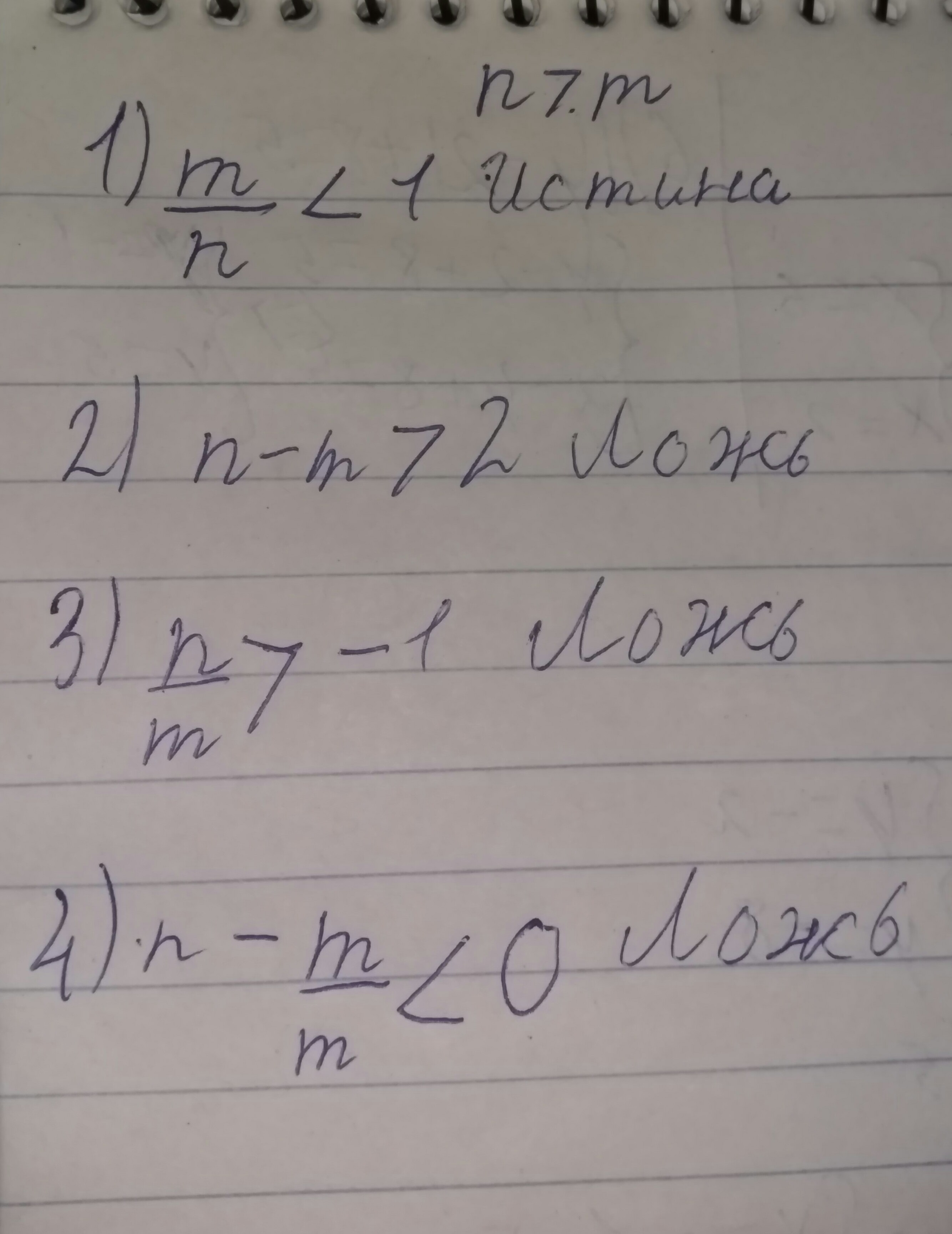 известно что m меньше n укажите верное неравенство m/n меньше 1 n-m больше 2 n/m больше -1 n-m/m меньше 0