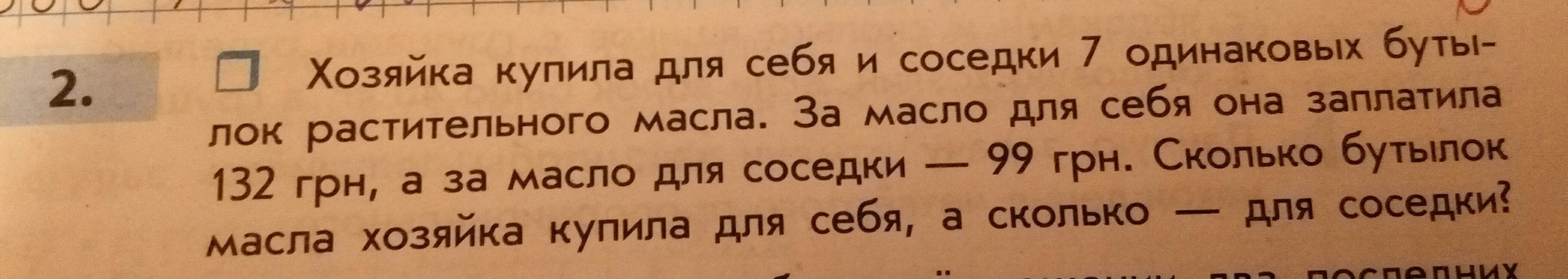 Ответ: для соседки 3 бутылки,для себя 4 бутылки.