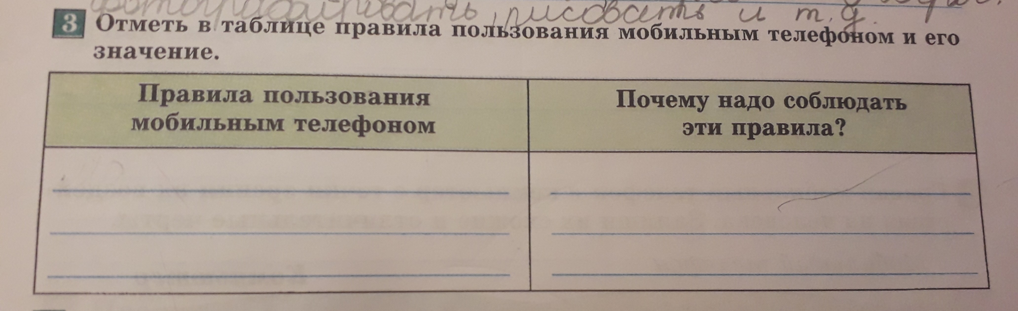 отметь в таблице правила пользования мобильным телефоном и его значение.
