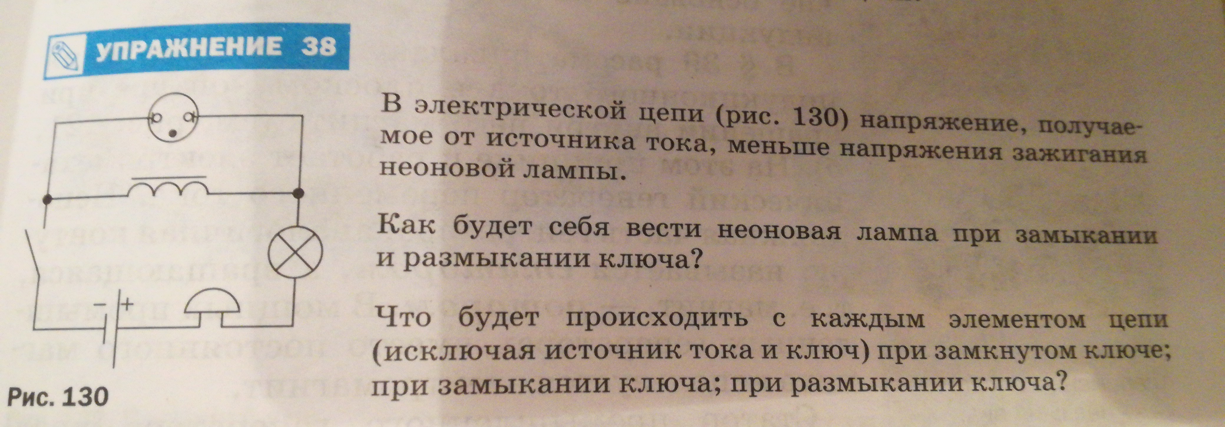 при замыкании ключа ток через катушку плавно начинает нарастать и через некоторое время начинает зажигаться лампа накаливания и звенеть звонок. напряжение на катушке изначально равнялось напряжению на источнике и потом снижается. этого напряжения недостаточно чтобы зажечь неоновую лампу