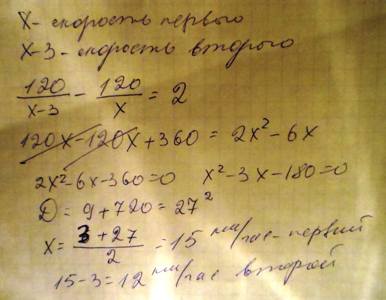 пусть х скорость второго а х+3это V(1) уравнение120/х-120/х+3=2