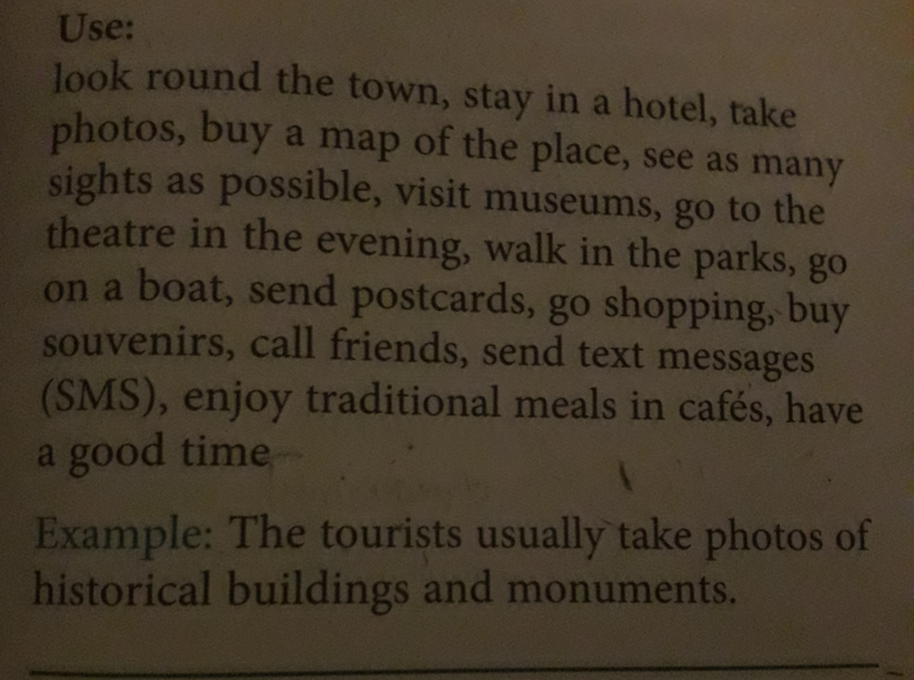 Осмотреться в городе, остановиться в отеле, сделать фотографии, купить карту местности, увидеть как можно больше знаков, посетить музеи, пойти в театр вечером, гулять в парках, отправиться куда-то на лодке, отправлять открытки, пойти за покупками, покупать сувениры, звонить друзьям, отправлять смс, наслаждаться традиционным обедом в кафе, хорошо проводить время.