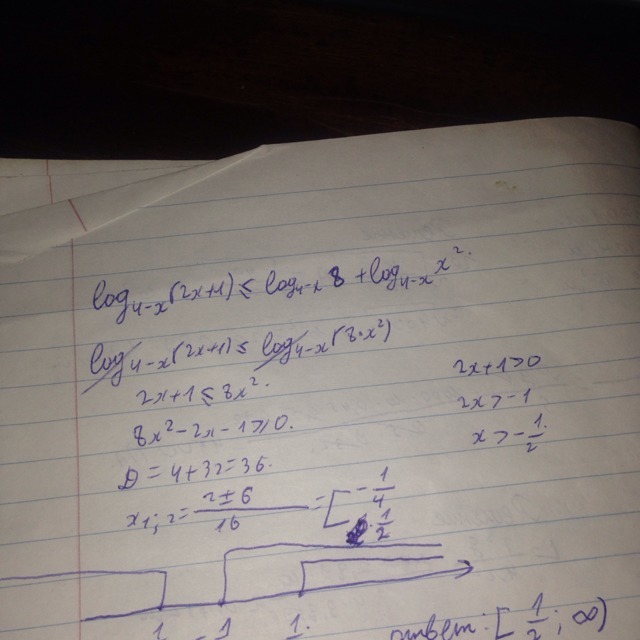 Так я свою ошибку видел смотри тут будет следующим образом все что я расписал это правильно но я забыл ещё область определения что 4-x неравно нулю и тогда выйдет x неравен 4 потом ты это вставляешь на интервал который я сделал и увидишь там ответ [1/2 до 4) и (4 до плюс бесконечности)