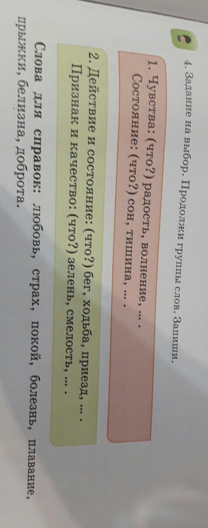 задание на выбор . продолжи группы слов. запиши .1. чувства : (что?) радость , волнение ,... состояние: (что?) сон, тишина ,... 2. действие и состояние : (что?) бег, ходьба, приезд, ..... признак и качество : ( что?) зелень , смелость, ......