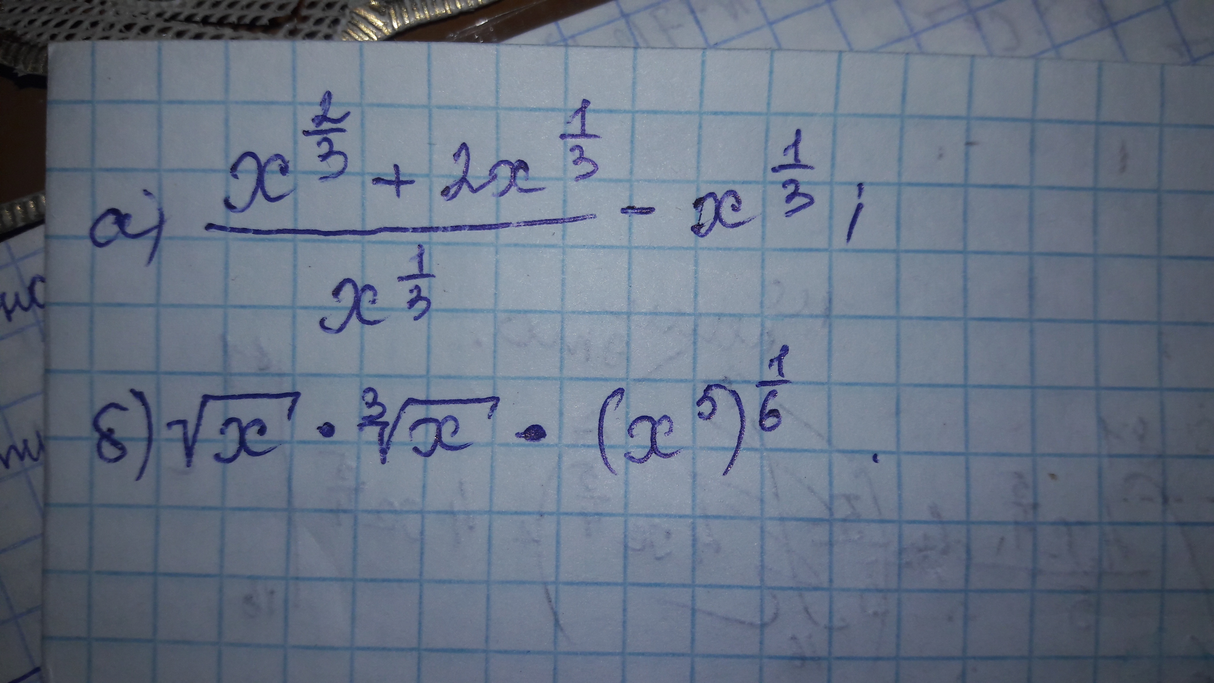 ![sqrt[6]{x^3*x^2} * x^{5/6} = sqrt[6]{x ^{10} } = sqrt[3]{x^5} sqrt[6]{x^3*x^2} * x^{5/6} = sqrt[6]{x ^{10} } = sqrt[3]{x^5}](https://tex.z-dn.net/?f=+sqrt%5B6%5D%7Bx%5E3%2Ax%5E2%7D+%2A+x%5E%7B5%2F6%7D+%3D+sqrt%5B6%5D%7Bx+%5E%7B10%7D+%7D+%3D+sqrt%5B3%5D%7Bx%5E5%7D+)