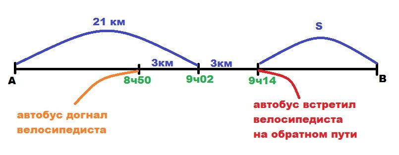 ⇒ Когда автобус догнал велосипедиста в 8.50, расстояние до пункта А было 21 - 3 = 18 км.