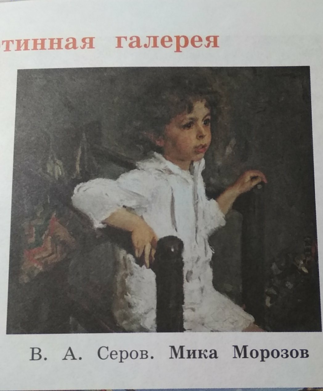 Художник В.А Серов написал замечательную картину ,,Мика Морозов,,На ней изображен маленький мальчик.Он сидит в детском кресле и смотрит куда-то в даль.