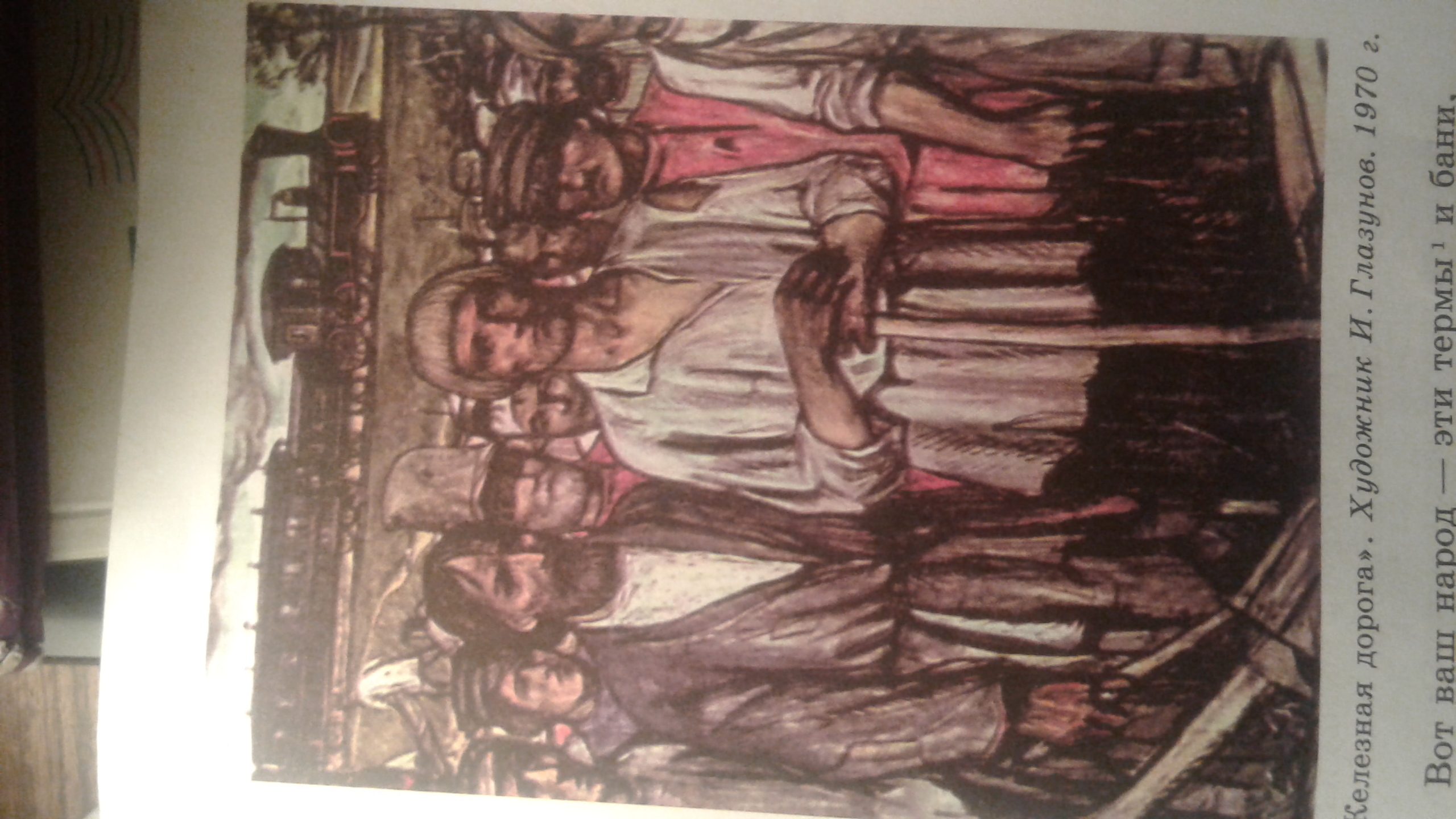 На картине мы видим крестьян. Они все земледельцы.на заднем плане изображён чёрный пассажирский поезд. на картине показывается вся бедность крестьян. Видно, что им живётся тяжело. Они не доедают. Одеты люди во что есть. В основном в рваные рубашки с заплатками. Эту картину художник посветил простым деревенским людям с тяжёлой судьбой.