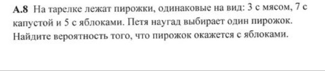 Ответ: вероятность того, что Петя возьмет пирожок с яблоком ⅓