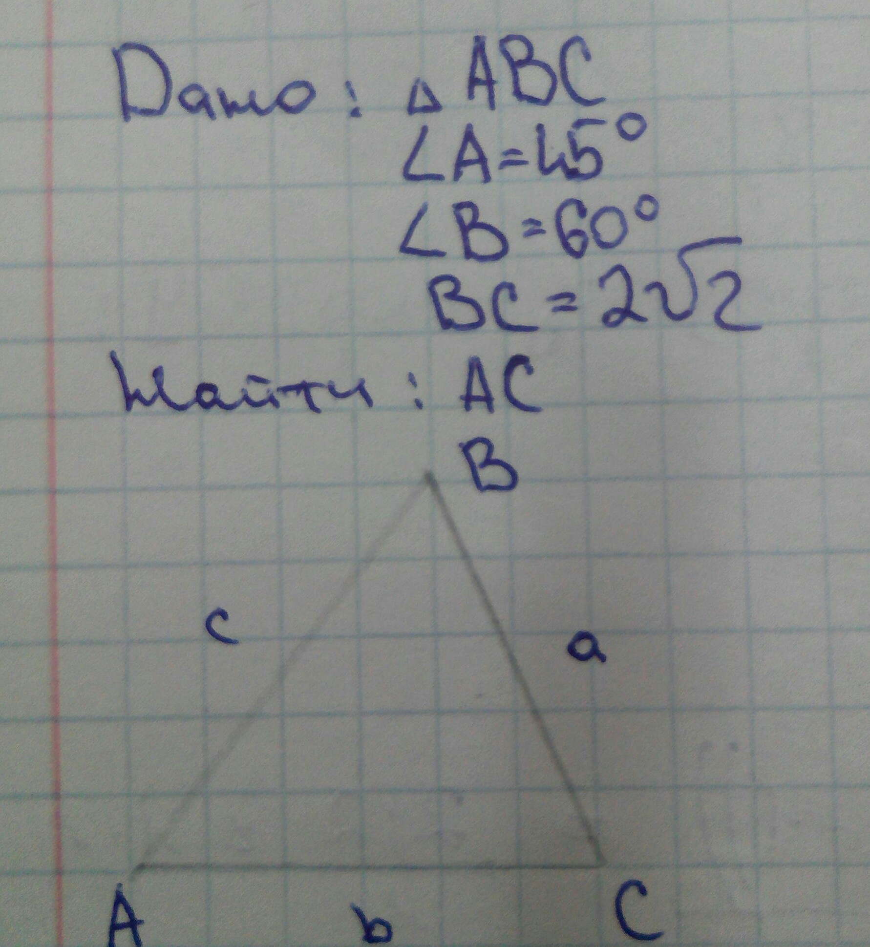 опускаем из В высоту на АС. точк пересечения с АС - Н Тогда угол НВА=45° Т к угол А=45°. А угол НВС=15°(60-45) АС=АН+НС АН=НВ=ВСcos15°