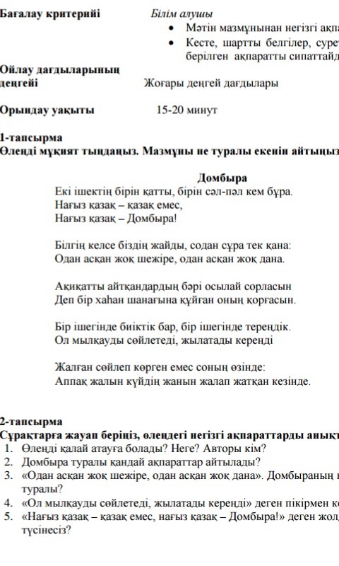 в этом тексте говорится о Казаск ом музыкальном инструменте добрые.