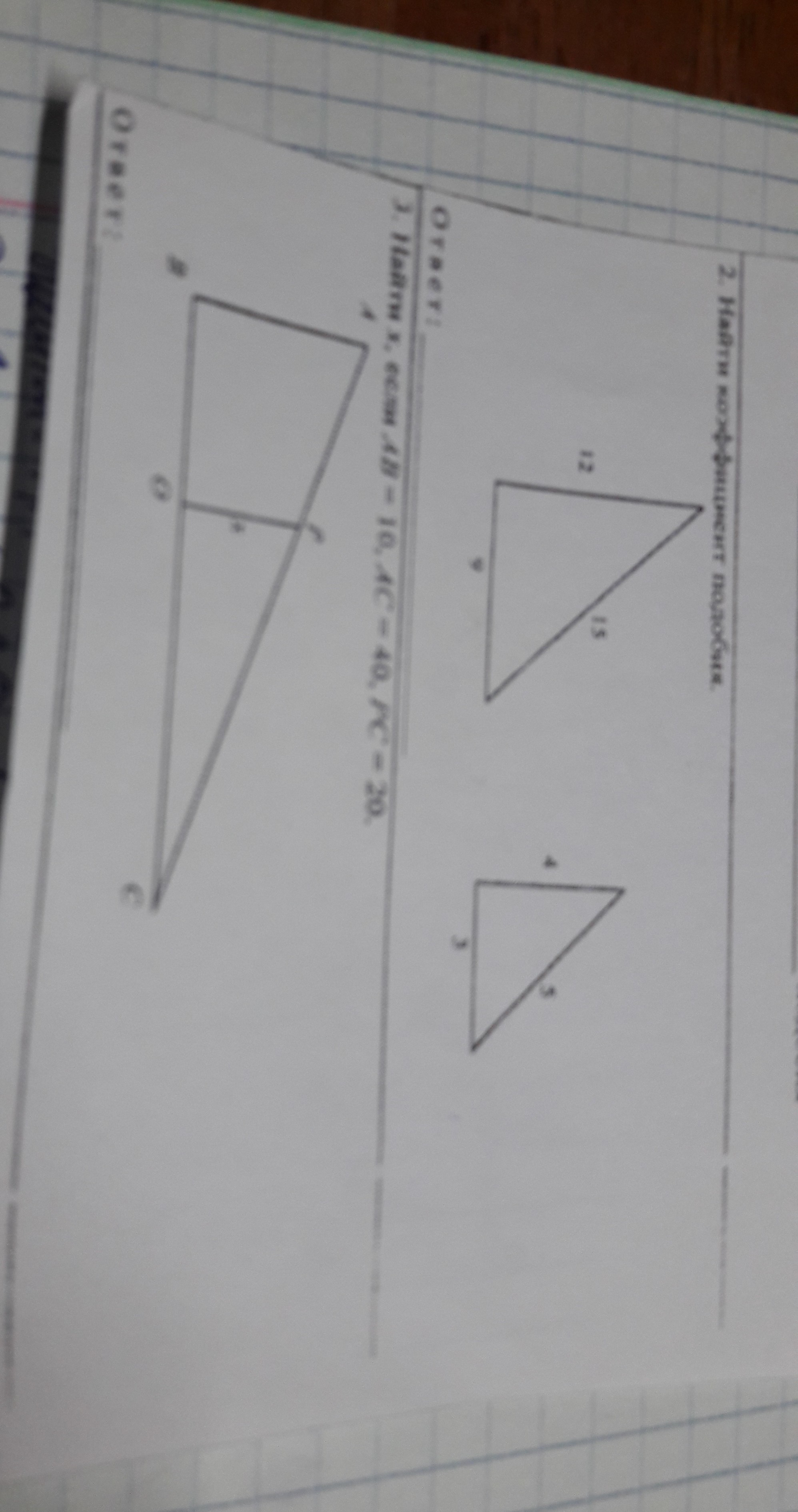Во второй задаче если В слева снизу, через теорему пифагора (квадрат гипотенузы равен сумме квадратов катетов) находим ВС (1600-100=1500) = 10корень15. Находим ОС: АС/РС=ВС/ОС=40/20=10корень15/х, находим х, он равен 0,5. Х=5корень15. По той же тиареме пифагора находим РО, (400-375=25) РО=5 см
