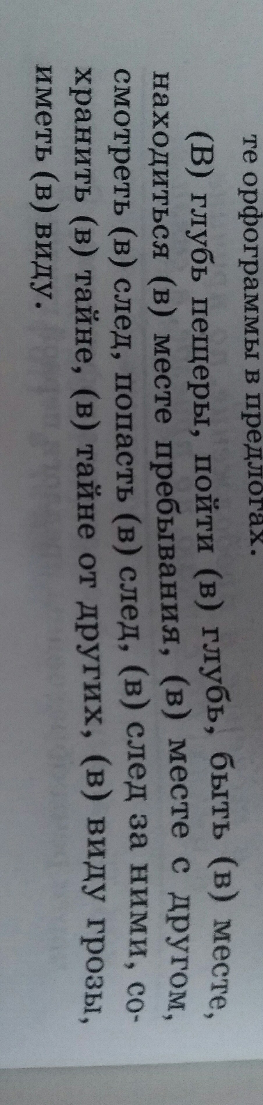 В глубь пещеры - в- пред. глубь-сущ. пещеры-сущ., пойти в глубь - пойти-гл. в-пред. глубь-сущ., быть на месте- быть-гл. на-пред. месте-сущ., быть на месте пребывания - быть-гл. на-пред. месте-сущ. пребывания-сущ., на месте с другом - на-пред. месте-сущ. с- пред. другом-сущ., смотреть на след- смотреть-гл. на-пред. след-сущ., попасть на след - попасть-гл. на-пред. след-сущ., в след за ними - в-пред. след-сущ. за-пред. ними-мест., сохранить в тайне - сохранить-гл. в-пред. тайне-сущ., в тайне от других- в-пред. тайне-сущ. от-пред. других-мест., на виду грозы- на-пред. виду-сущ. грозы-сущ., иметь в виду- иметь-гл. в-пред. виду-сущ..