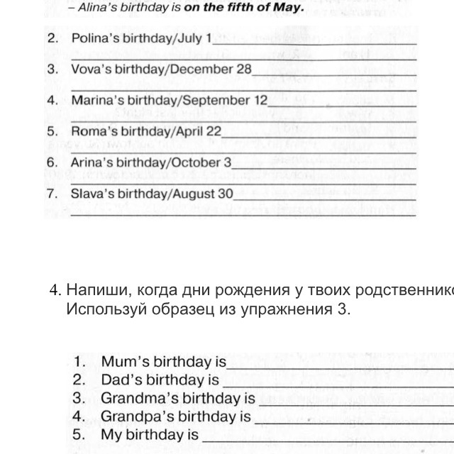 в 4-ом задании точно также напишешь, только употребляя даты своих знакомых.