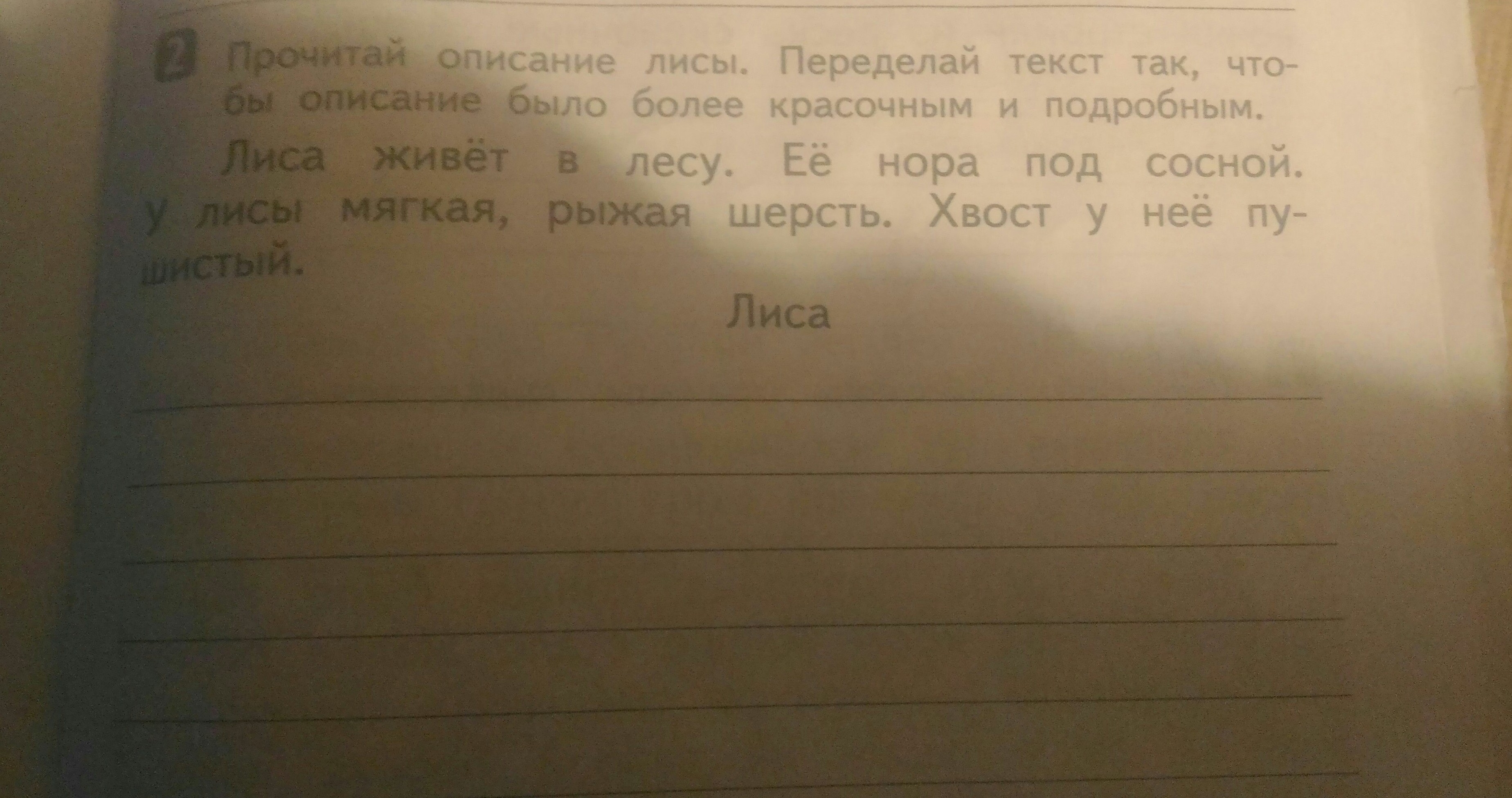 Лиса-красивое животное.Она живет в лесу. Её нора находится под сосной.У лисицы мягкая, рыжая шерсть, пушистый хвост, и глаза у неё светятся, как огоньки.