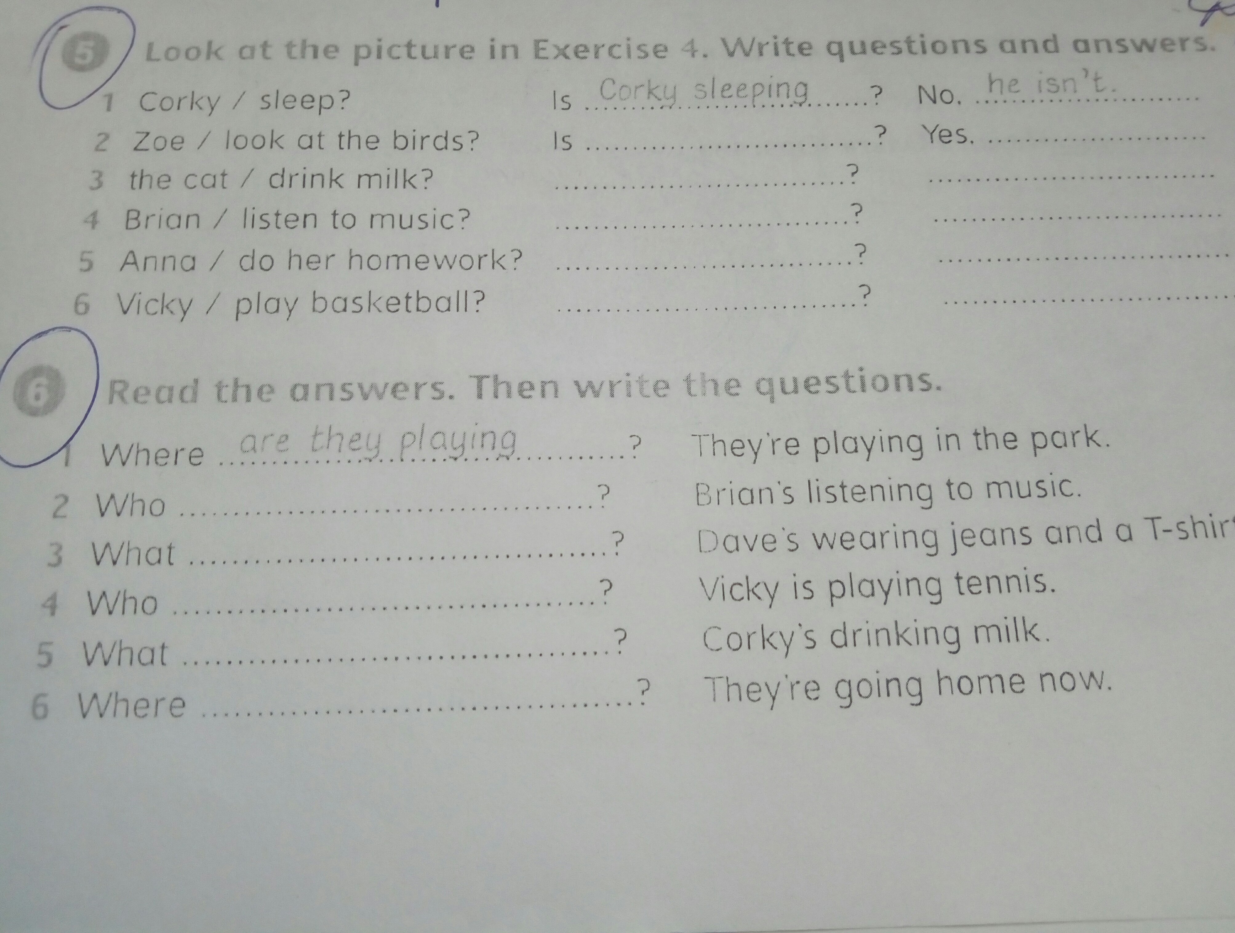 2.Is Zoe looking at the birds?Yes, she is.3.Is the cat drinking milk?Yes/No, is/isn't.4.Is Brian listening to music?Yes/No, he is/isn't.5.Is Anna doing her homework.Yes/No, she is/isn't6. Is Vicky playing basketball?Yes/No, she is/isn't