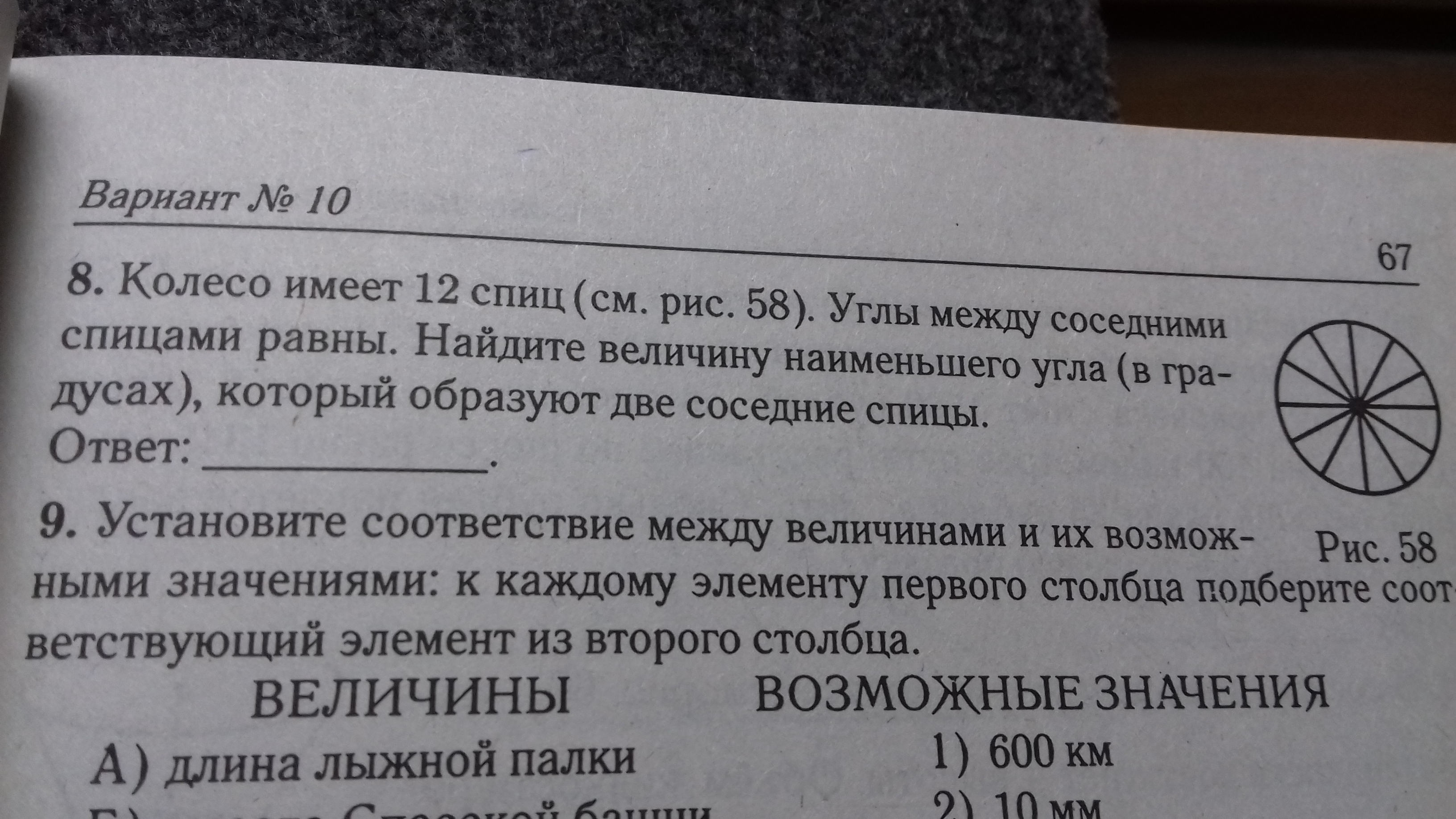 8. Колесо имеет 12 спиц .углы между соседними спицами равны.нацдите величину наименашего угла (в градусах),которыйобразует две соседние спицы.