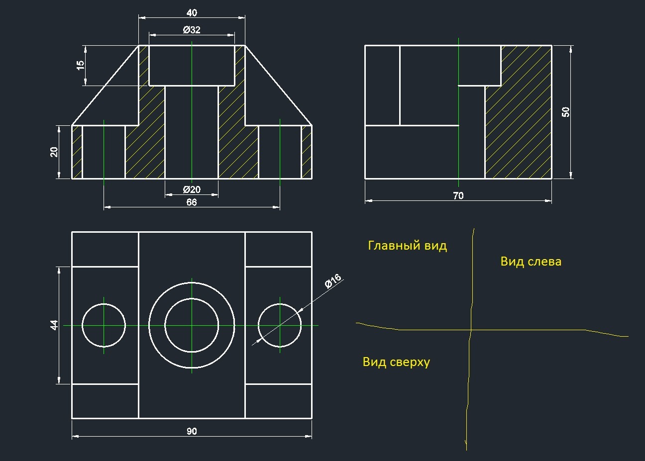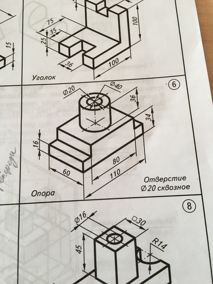 Деталь называется опора. Деталь представлена следующим набором геометрических тел: в основании детали лежит прямоугольный параллелепипед длиной 110 мм., шириной 60 мм., высотой 34 мм. По краям ширины, деталь имеет по обе стороны, сплошные вырезы 15 мм. к центру детали, и 18 мм. на высоту параллелепипеда. В центре параллелепипеда установлен цилиндр диаметром 40 мм., высотой 36 мм. По центру цилиндра, просверлено отверстие на всю высоту детали, диаметром 20 мм. Габаритные размеры детали - 110х60х70 мм.