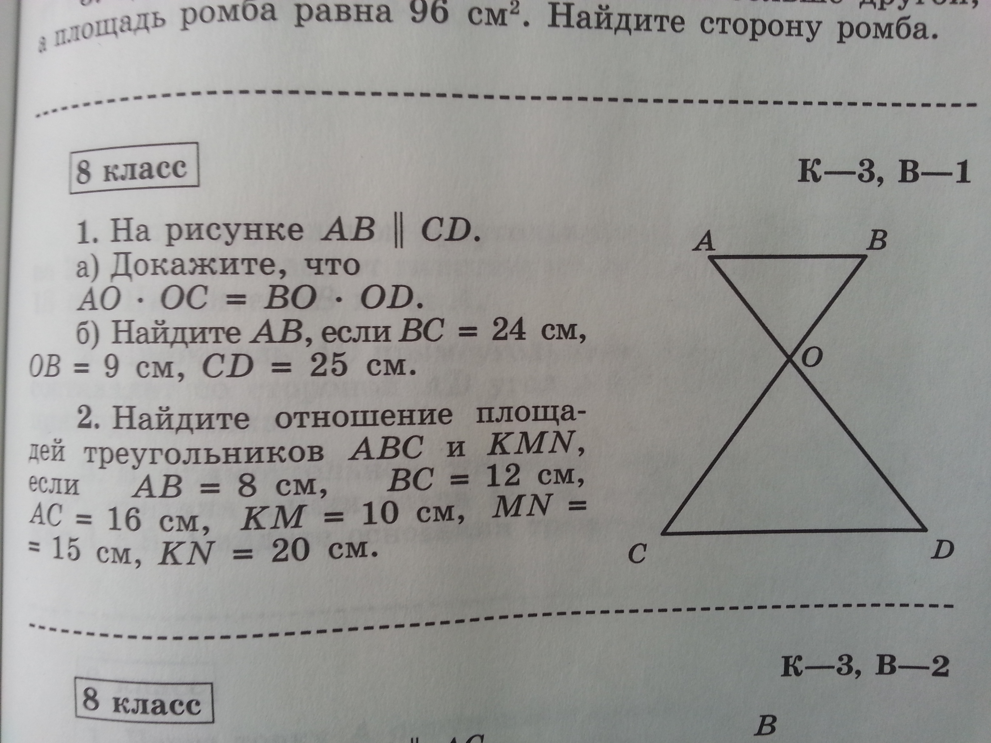 Значит треугольники ABO и OCD подобны по двум углам. Тогда из подобия треугольников следует, что AO:OD=BO:OC или AO*OC=BO*OD