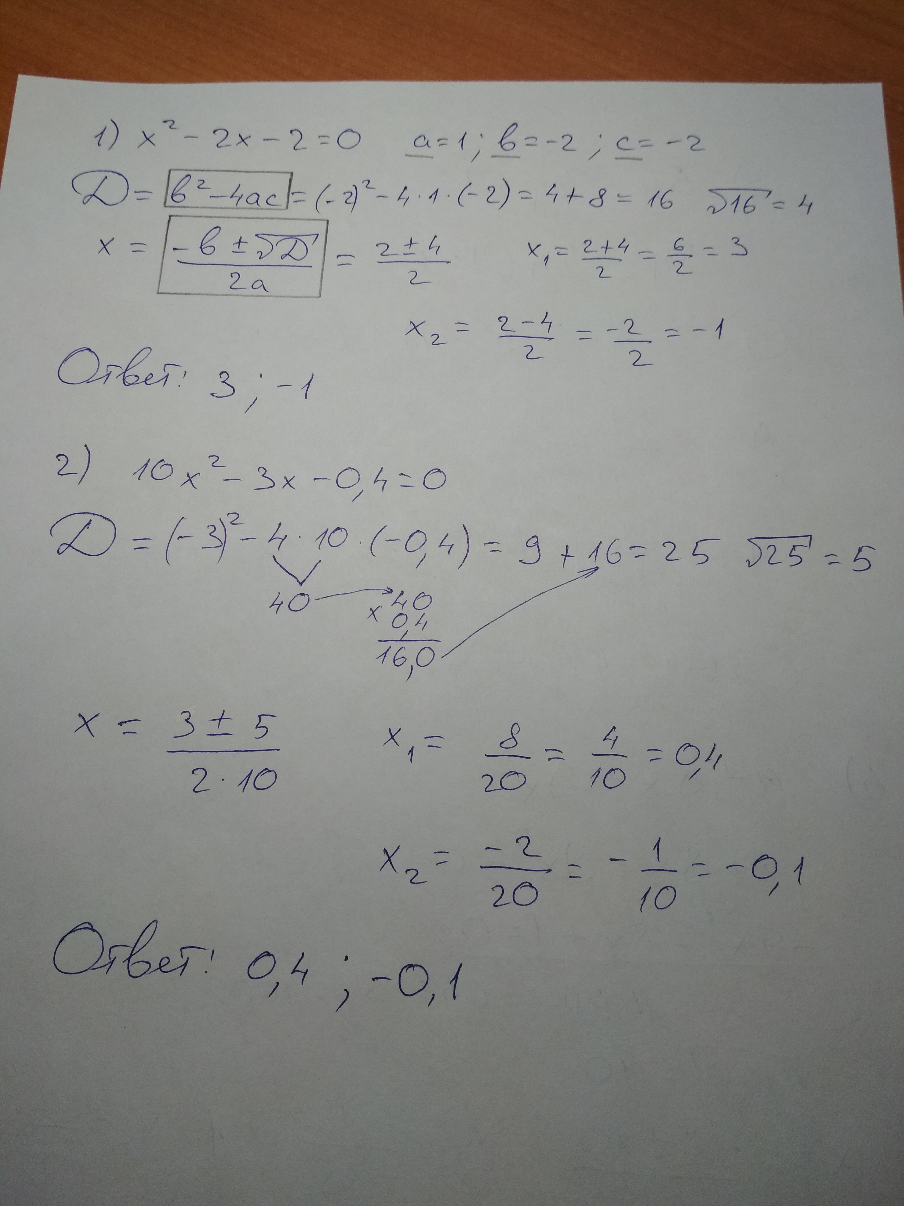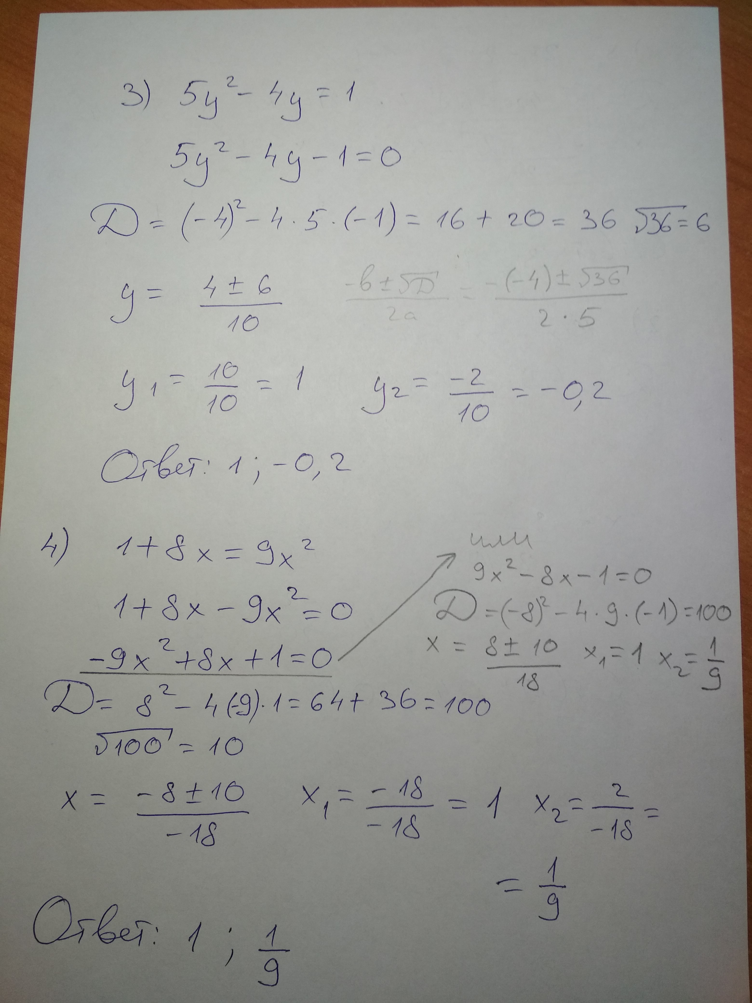 Решите квадратные уравнения х^2-2х-2=0 2). 10х^2-3х-0,4=0. 3). 5у^2-4у=1. 4). 1+8х=9х^2. на листочке пожалуйста если не сложно.