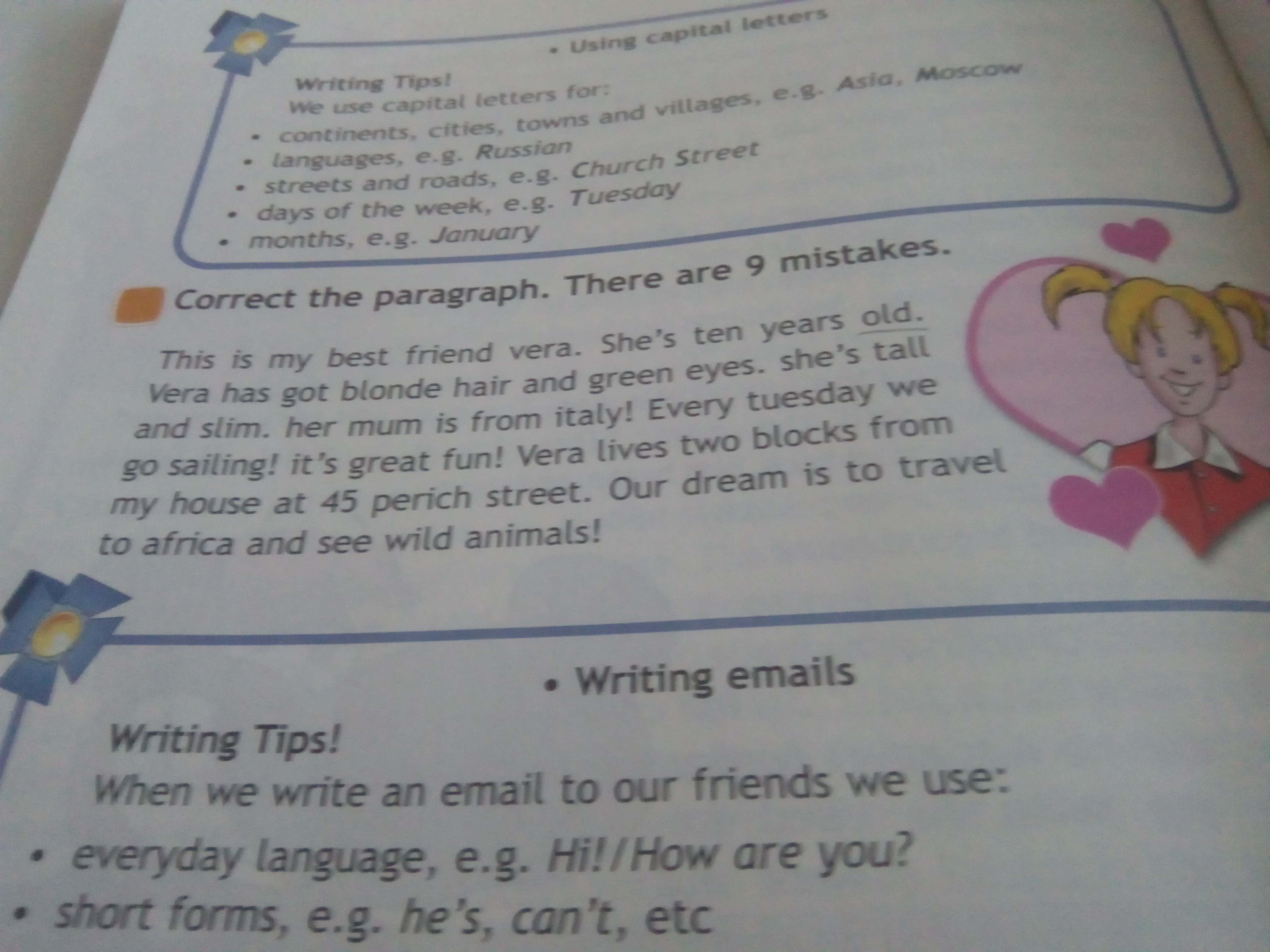 This is my best friend Vera. She's ten years old. Vera has got blonde hair and green eyes. She's tall and slim. Her mum is from Italy. Every Tuesday we go sailing. It's great fun. Vera lives two blocks from my house at 45 Perich Street. Our dream is to fly to Africa and see wild animals.