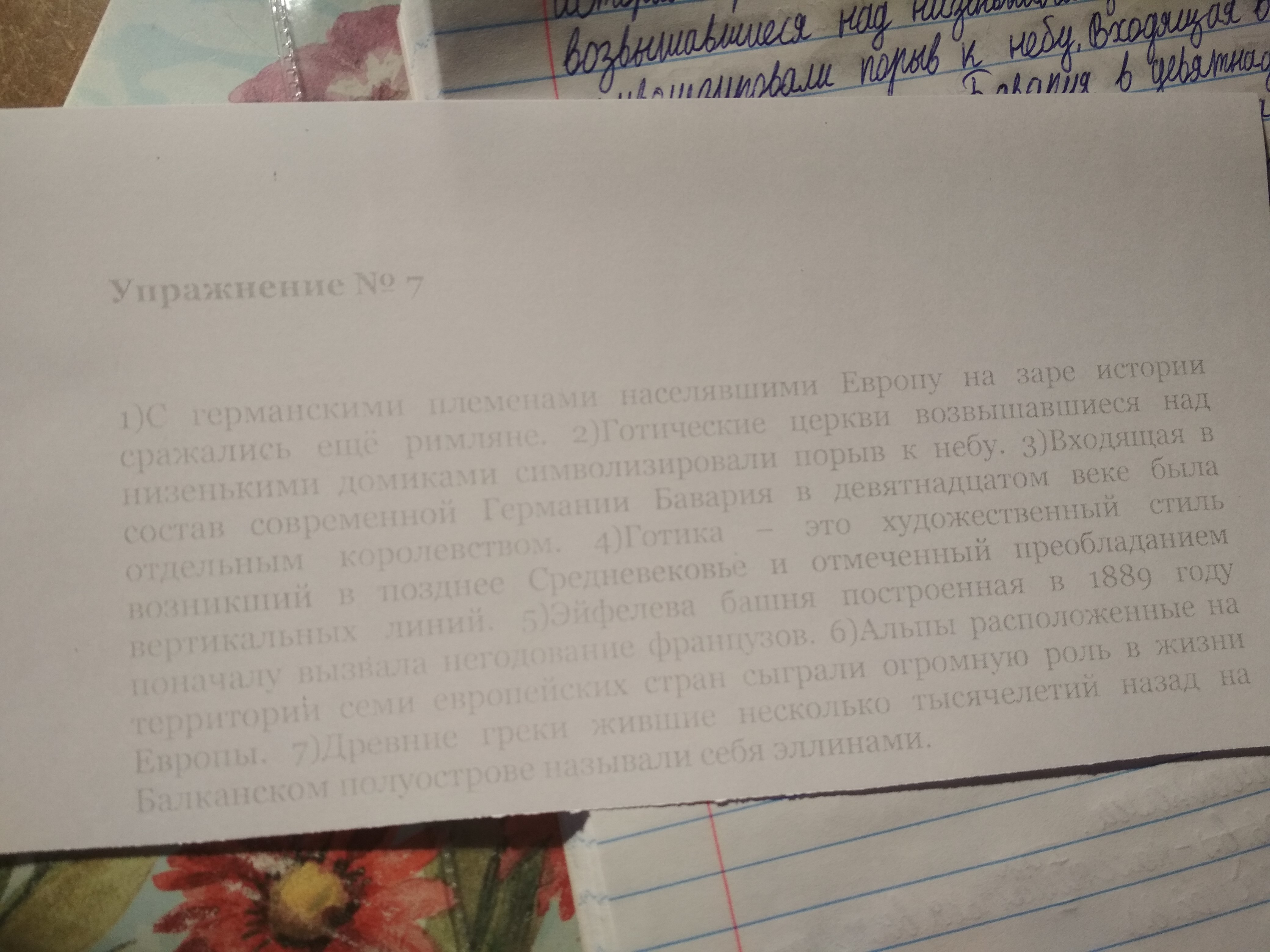 .........................................1)С германскими племенами, / населЯ ВШими Европу/, на заре истории сражались ещё римляне. 2)Готические церкви,/ возвышА ВШиеся над низенькими домиками,/ символизировали порыв к небу. 3)/ВходЯЩая в состав современной Германии/ Бавария в девятнадцатом веке была отдельным королевством. 4)Готика – это художественный стиль ,/возникШий в позднее Средневековье и отмечЕННый преобладанием вертикальных линий/. 5)Эйфелева башня,/ построЕННая в 1889 году ,/поначалу вызвала негодование французов. 6)Альпы,/ расположЕННые на территории семи европейских стран,/ сыграли огромную роль в жизни Европы. 7)Древние греки ,/жиВШие несколько тысячелетий назад на Балканском полуострове,/ называли себя эллинами. / ~~~~ / причастные обороты. Суффиксы обозначены ТАК.