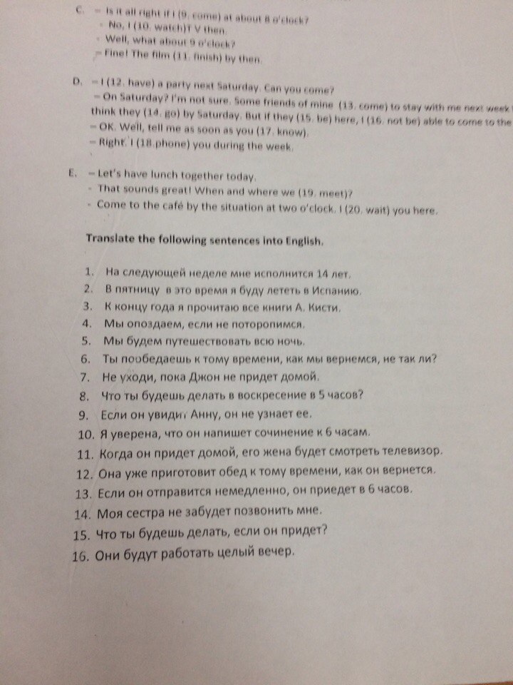 1 next week I will be 14 years.Friday is yelling going to fly Spain3. By the end of the year read all the books And Brushes,We'll be late if don't hurry,5 We will travel all night,You will have lunch by the time WeDon't leave until John comes homeWhat are you doing Sundayhours?9. If he sees Anna, he doesn't know.10. I'm sure he will write an essay b hours1. When he comes home, his wife will be watching TV12. It's already lunch by the time he returns.13. If he went immediately, He would arrive 6 hours14. My sister will not forget to call me:15. what will you do if He comes?16. They will work the whole eveningit?