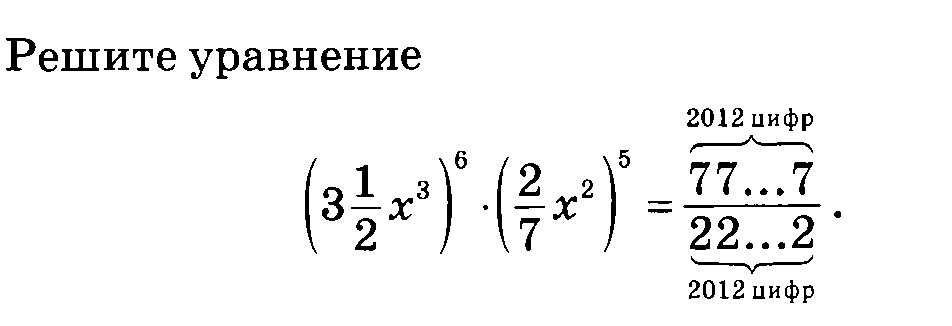 (3 frac{1}{2} x^{3} ) ^{6}*( frac{2}{7} x^{2}) ^{5}= frac{77...7}{22...2} \\ frac{7 ^{6} }{2 ^{6} }x ^{18}* frac{2 ^{5} }{7 ^{5} }x ^{10}= frac{77...7}{22...2}\\ frac{7}{2}x ^{28} = frac{77...7}{22...2} \\ x^{28}= frac{11...1}{11...1} \\ x^{28} =1\\x _{1}=1\\x _{2} =-1