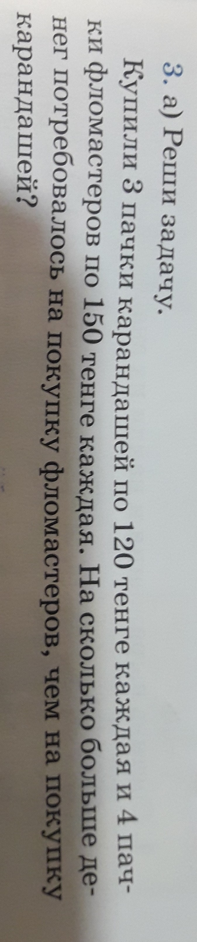 Купили 3 пачки карандашей по 120 тенге каждая и 4 пачки фломастеров по 150 тенге каждая.На сколько больше денег потребовалось на покупку фломастеров чем на покупку карандашей?