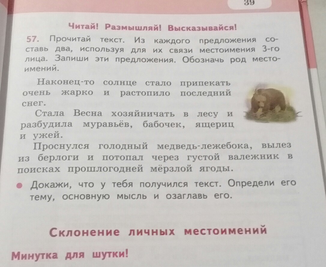 Наконец-то солнце стало припекать очень жарко. Оно растопило последний снег. Стала весна хозяйничать в лесу. Она разбудила муравьев, бабочек, ящериц и ужей. Проснулся голодный медвель-лежебока. Он вылез из берлоги и потопал через густой валежник в поисках прошлогодней мерзлой ягоды.