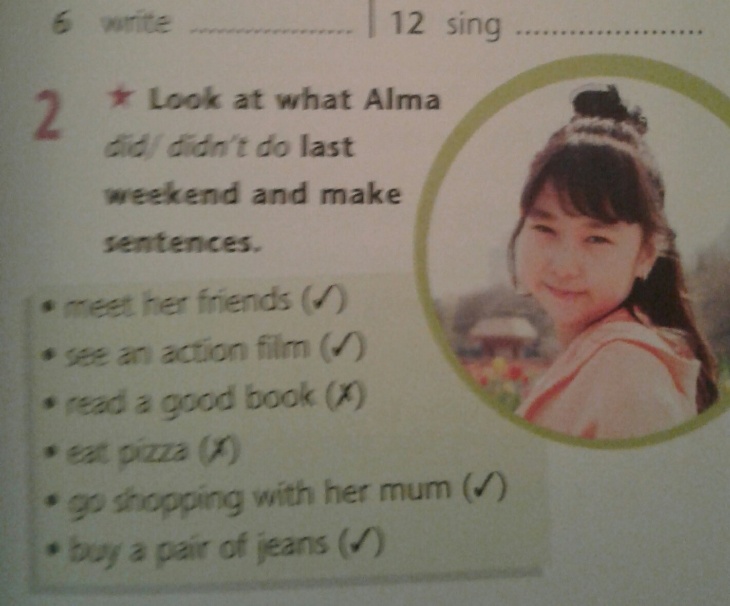2.Alma saw an action film last weekend.