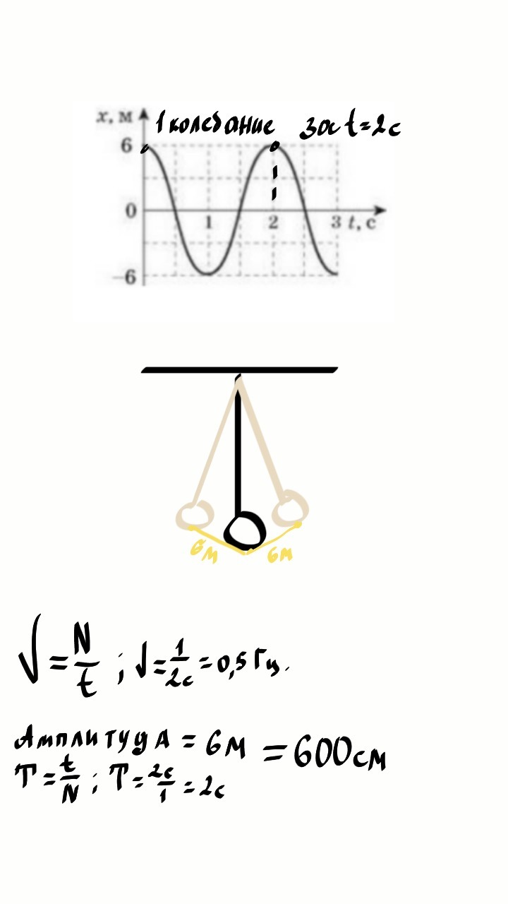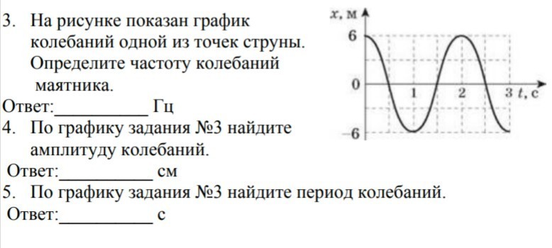 4. Амплитуда колебаний - это максимальное расстояние, на которое может отклониться от положения равновесия тело. Положение равновесия на графике - точка 0 м, максимальное отклонение от нее - 6 м. Положение равновесия на моем рисунке - черный шарик, максимальное отклонение бежевого шарика от черного так же 6 м.