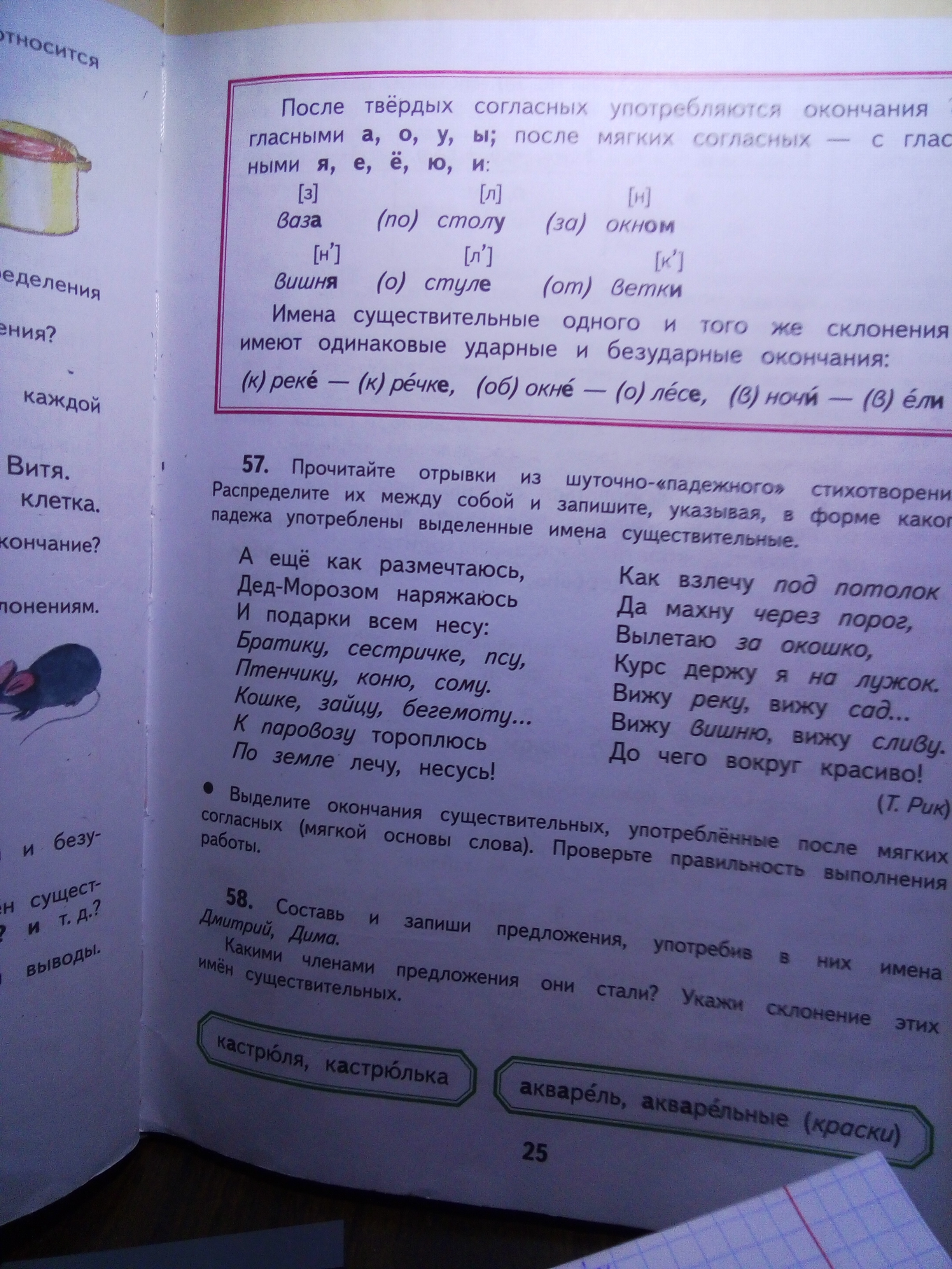 Дед морозом т.п подарки в.п. братику,сестричке,псу,птенчику,коню,сому,кошке,зайцу,бегемоту,к паровозу,по земле-все д.п., под потолок , через порог,за окошко. Курс,лужок,реку,сад,вишню,сливу-все в.п