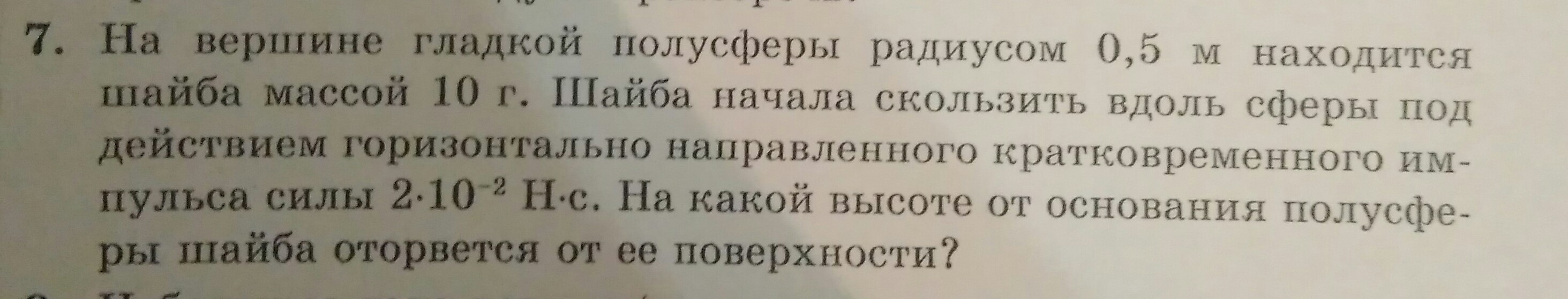 На вершине гладкой полусферы, радиус которой 0,5 м, находится шайба массой 10 г. Шайба начинает скользить под действием горизонтально направленного кратковременного импульса силы 2×10^-2 Н×с. На какой высоте от основания полусферы шайба оторвется от ее поверхности?