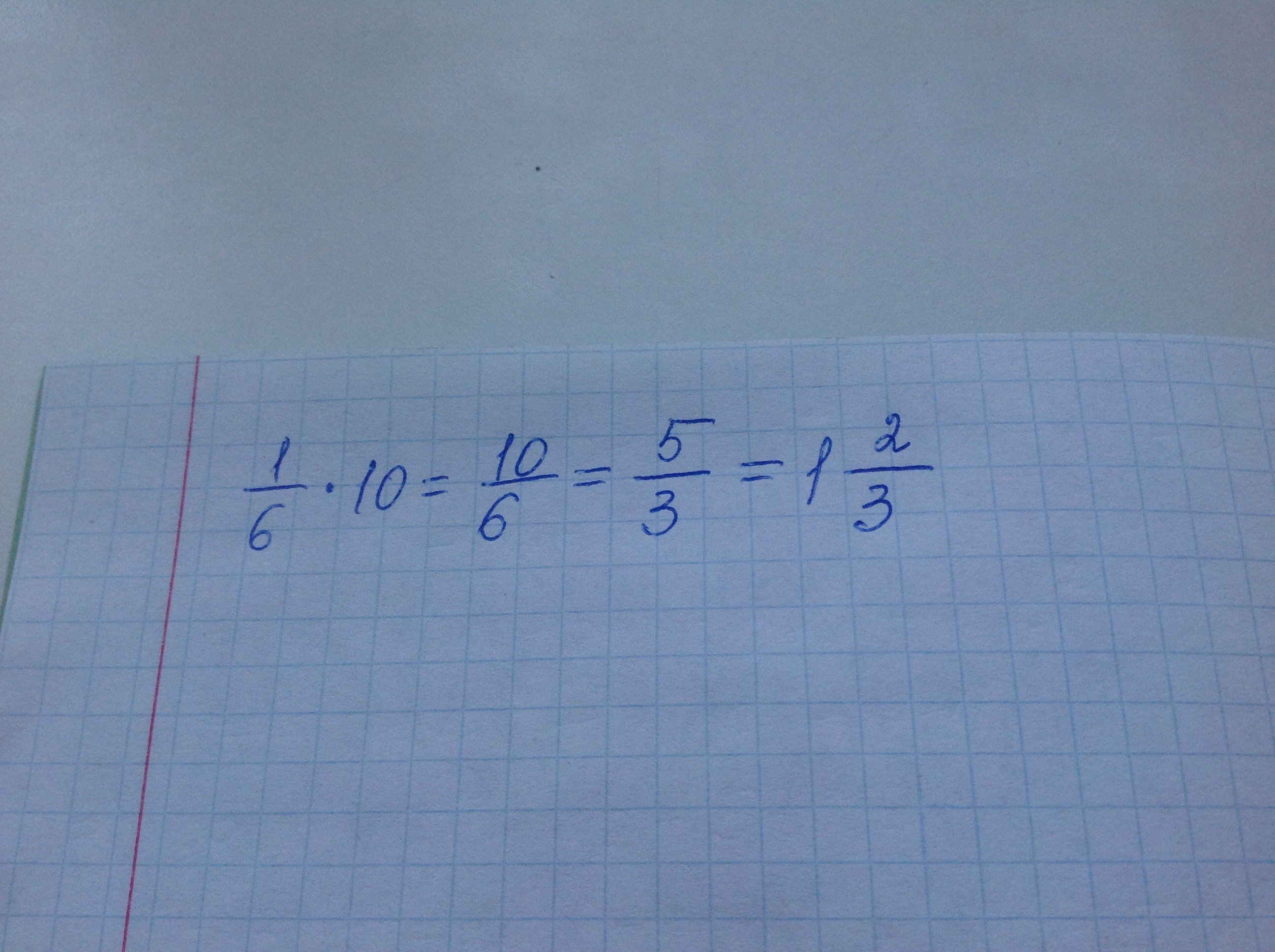 1/6 * 10 = 1/6 * 10/ 1 = 10/6 = 1_4/6 = 1_2/3