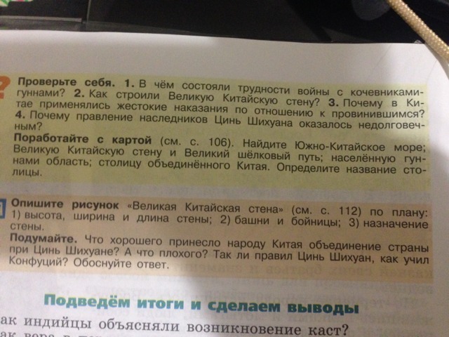 на 1 вопрос ответа не помню, 2 вопрос- великую Китайскую стену строили таким обрвзом:обычных людей отрывали от работ и заставляли строить, таскать тяжёлые камни,3 вопрос-за незначительную провинность человека били по пяткам бамбуковой палкой или отрезали нос, а если преступление бвло серьёзным могли и казнить, 4 вопрос- когда умер Цинь Шихуань через несколько лет народ сверг ненавистных угнетателей