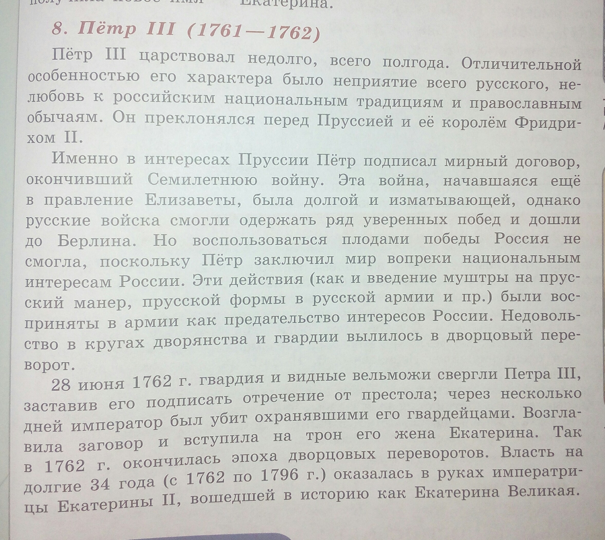 Петруха очень не любил Россию, но зато поклонялся Фридриху II, королю Пруссии, с которой Россия вела войну. Петруха подписал мирный договор с кумиром своим ( плюнул, га д, на интересы России). Дворянство было недовольно этим договором, и они его за это скинули с престола.