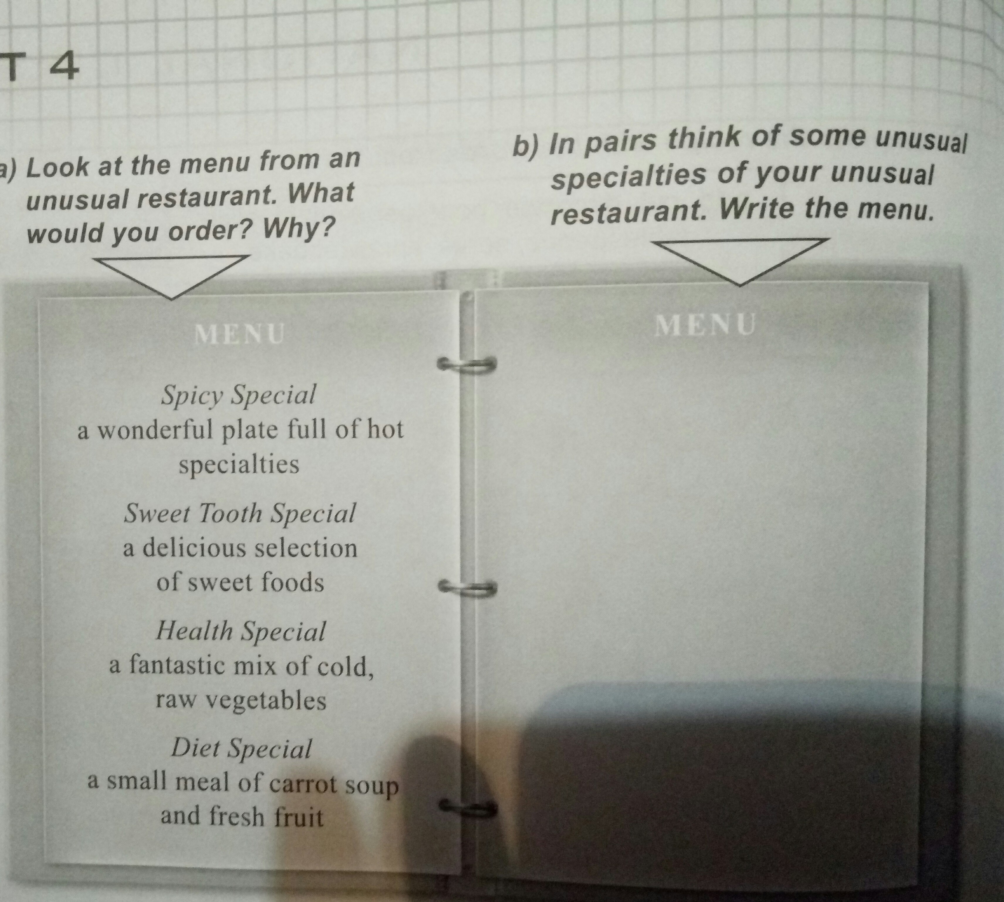 От тебя требуется написать специальные блюда, если бы у тебя был свой ресторан. Открой переводчик и пиши туда все что в голову придет( например суши, крекеры, отбивная, селедка под шубой, бургер, дошик, изюм, мороженное(то чувство когда голод обостряется ночью))