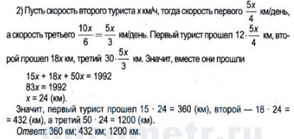 Три туриста прошли вместе 1992 км . Первый был в пути 12 дней , второй - 18, третий - 30 дней . Первый турист за 4 дня прошел сколько, сколько второй за 5 дней , а третий - за 6 дней столько , сколько второй за 10 . Сколько километров прошел каждый турист?